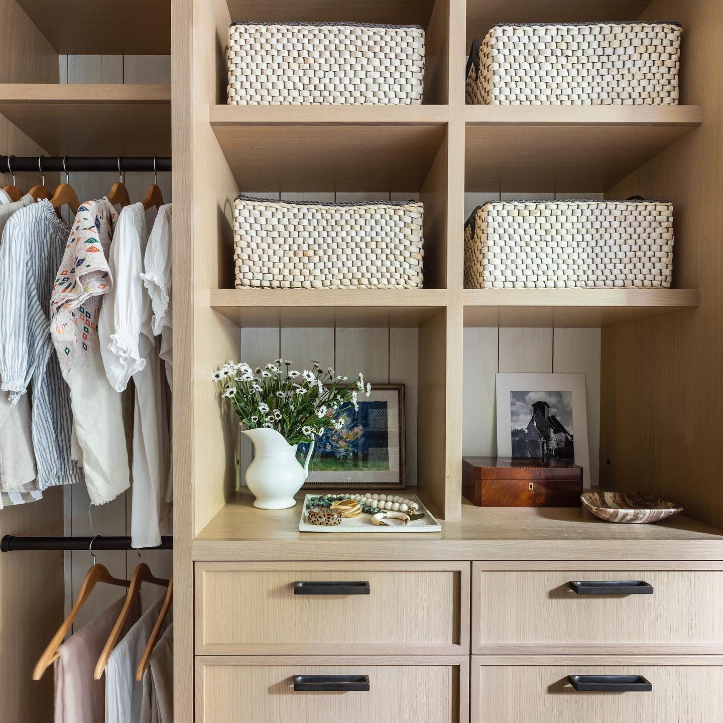If your closet has the space for a dresser or chest of drawers, and it fits with the layout, it's a logical spot for added clothing storage. Built-in shelving and drawers are also wonderful if they're a possibility for your closet. If you don't have open shelves in your closet, dresser drawers are the next best option.