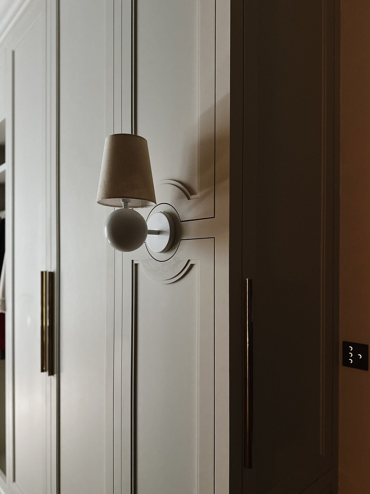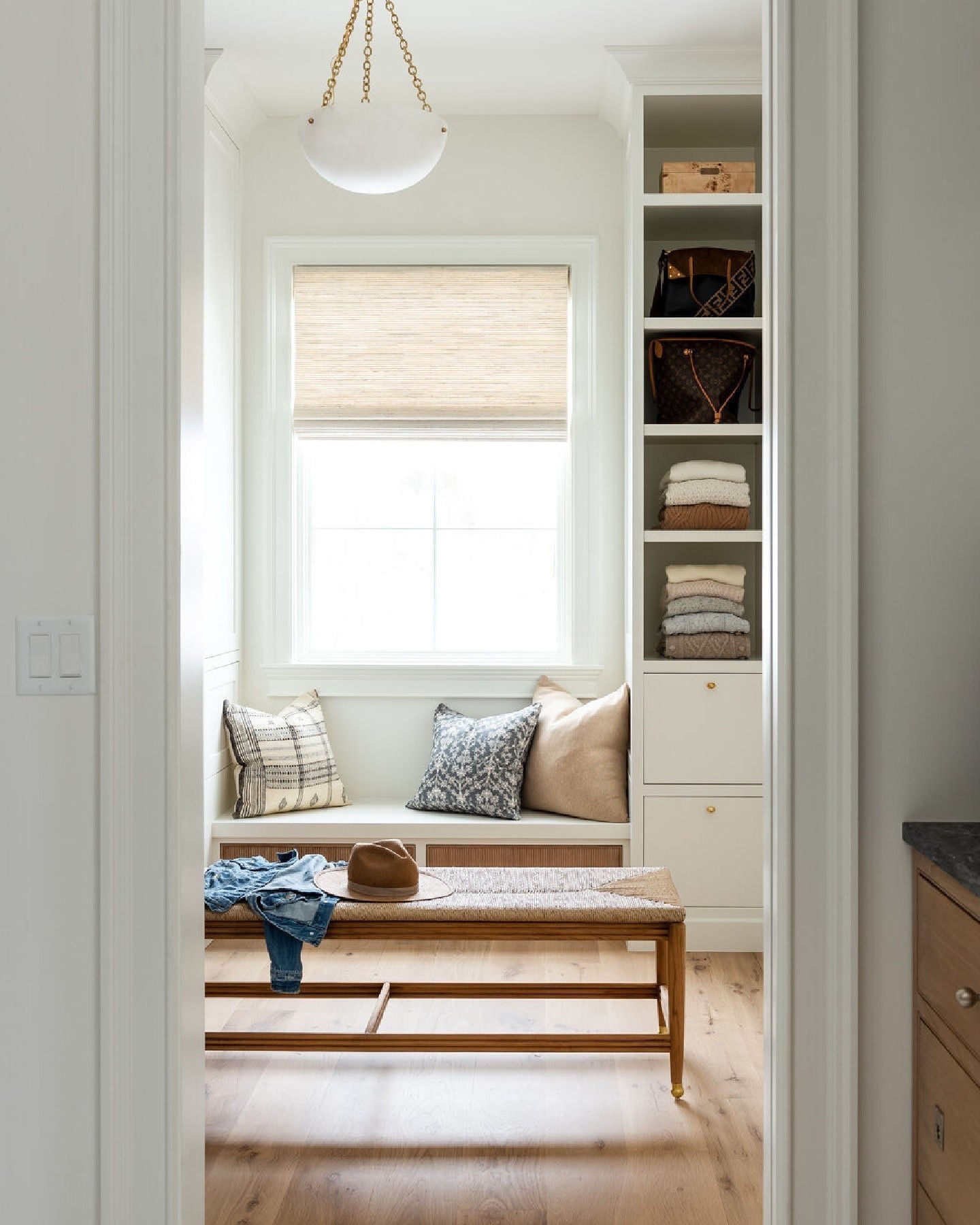 Lighting is a crucial component of any closet as well. It’s worth choosing flattering but bright light so you can see anything amiss, like a stain or loose thread (or navy blue versus black). Direct natural light can fade clothing over time, so good window coverings are a must if there are windows in your closet.