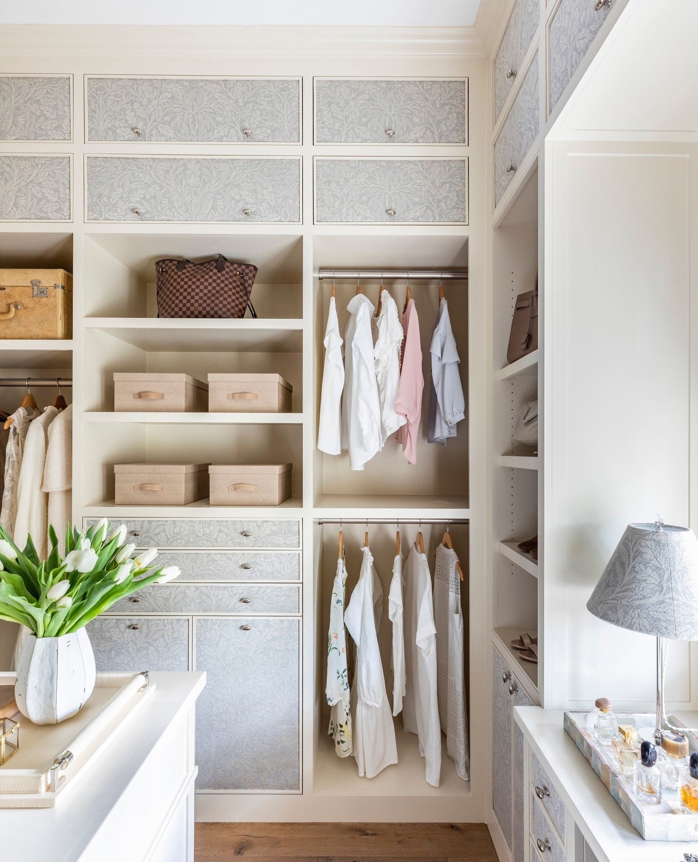 I love a closet that has a few pretty touches. These might be in the form of accessory storage—jewelry organizers and trays atop a dresser or an eye-catching scarf rack. You may also want a table with a small catch-all for frequently used jewelry and smaller items. If you have room, a lamp, fresh flowers, or even a cool piece of art can make your closet feel like a room in itself.