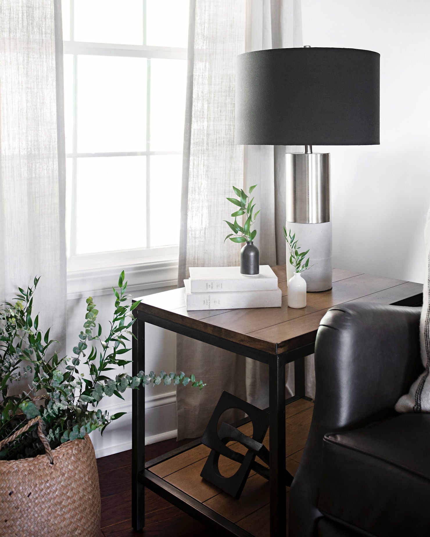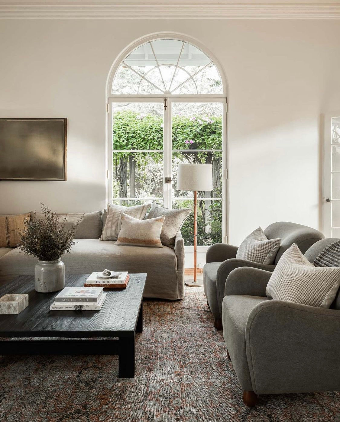 On the other hand, a square or rectangular coffee table can sometimes feel a bit more formal. I like the look of paring two square tables together, provided they fit the dimensions of your sofa. It can give you a little more room and feel particularly appropriate in a larger space.
