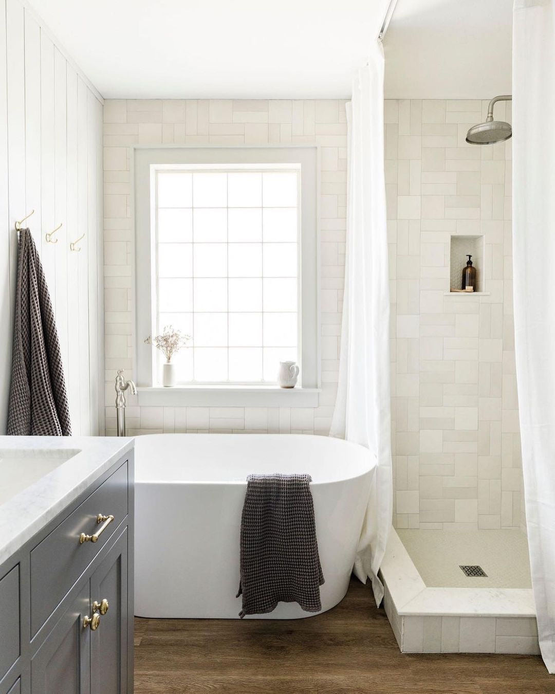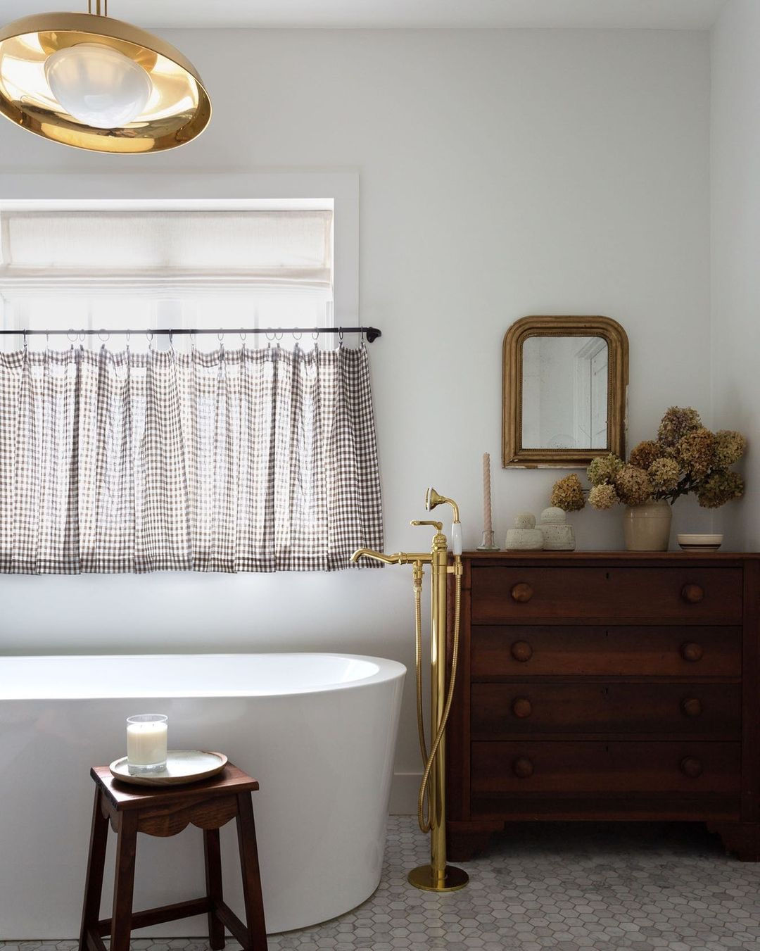 Any time you include fabric in a room like a bathroom or a kitchen, you’ll want to choose materials that are natural, breathable, and quick-drying. Look for linen, cotton, hemp, and even fabric made from bamboo for great options in these high-traffic, high-moisture spaces.