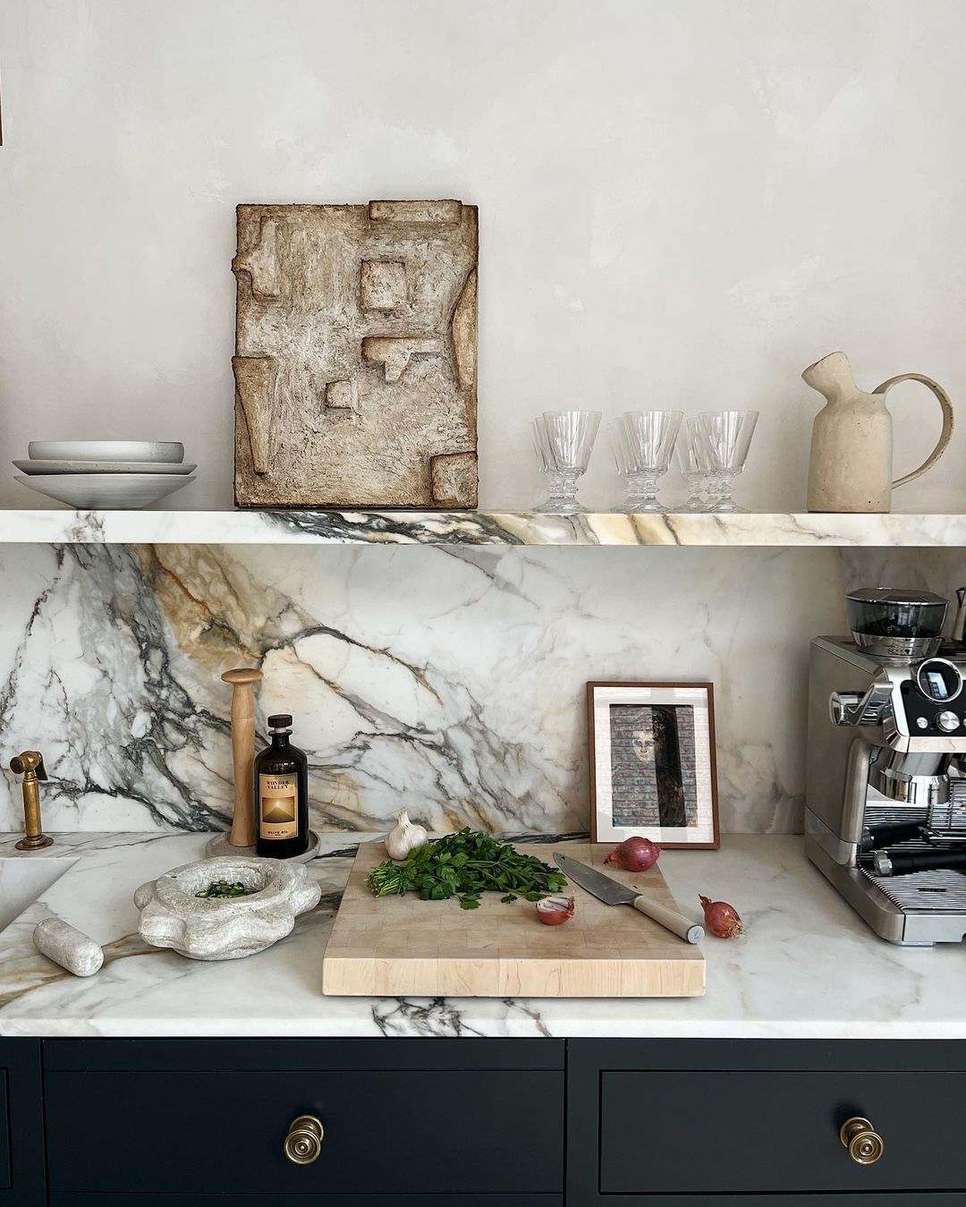Here, we explore the idea of the cabinetless kitchen, whether you prefer open shelving, a backsplash without upper cabinets at all, or my personal preference, marble ledges and shelves.
