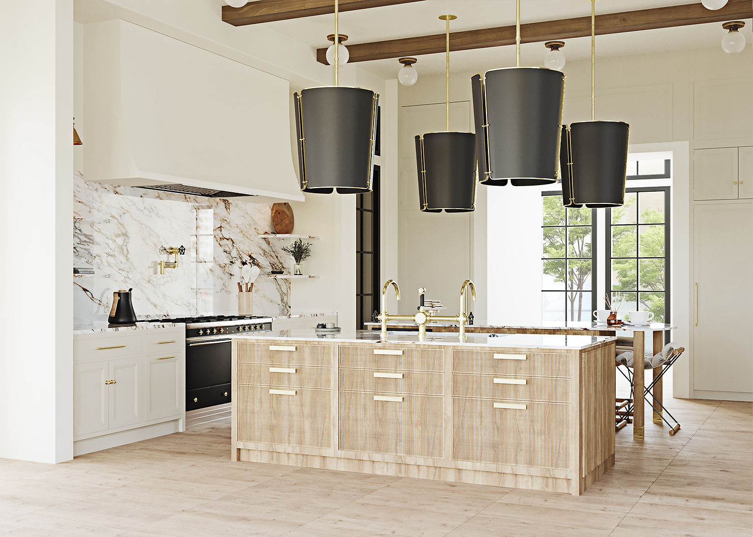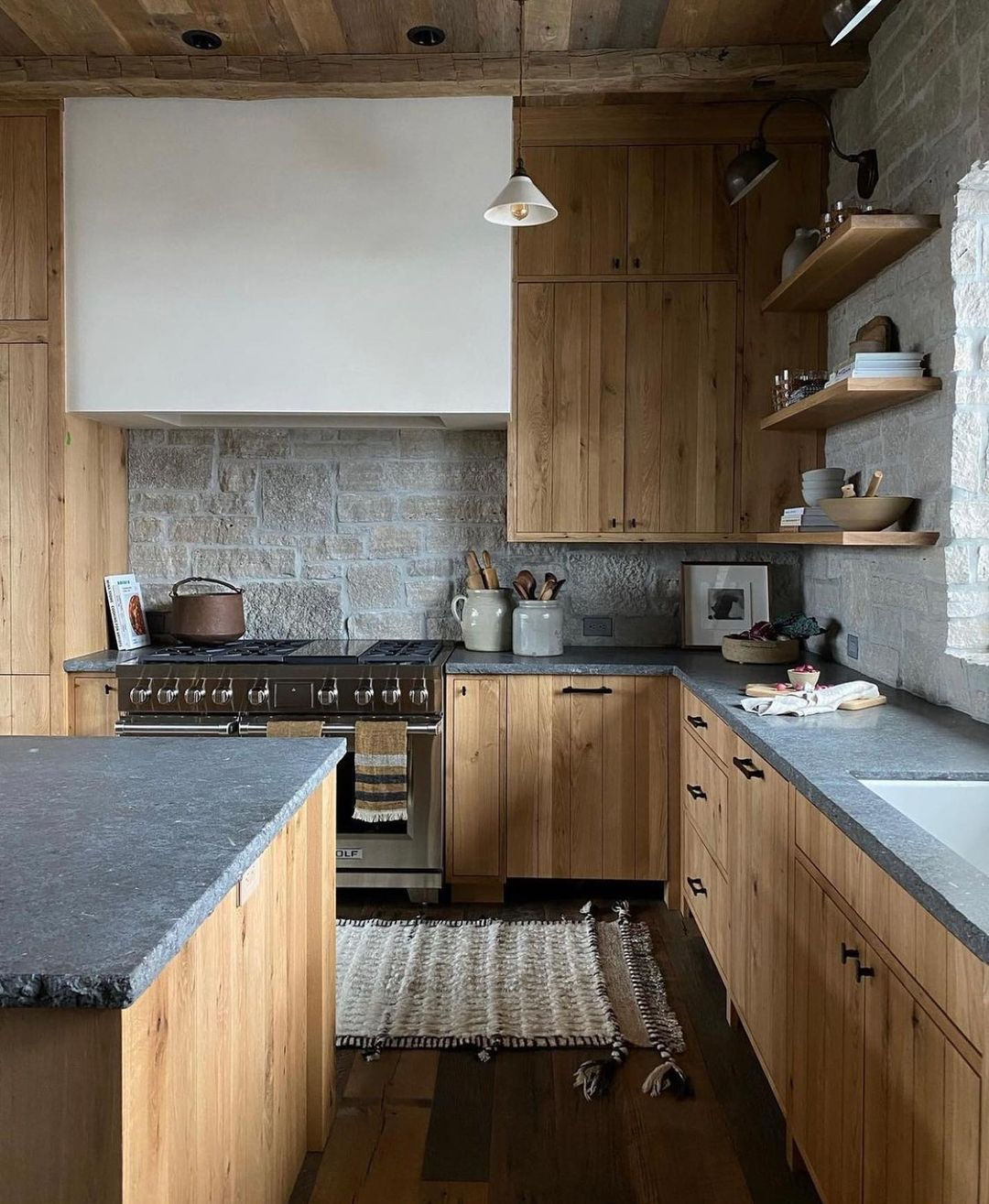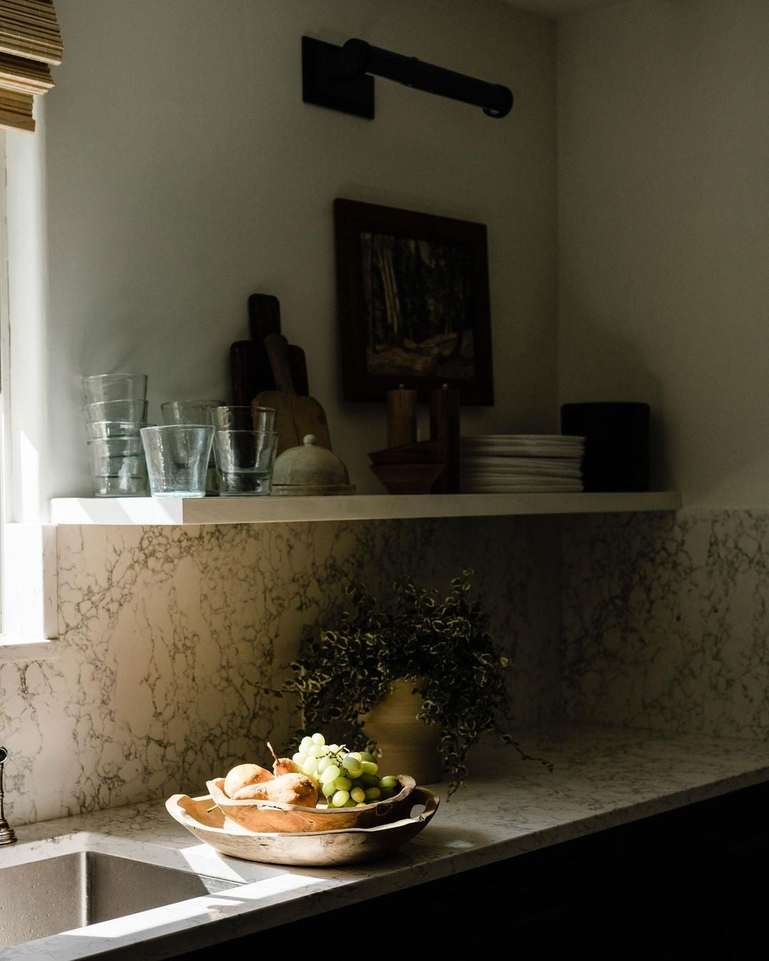Seek out pieces that fit your style and kitchen design but look for unique items that you genuinely love and feel excited about. Consider making the kitchen itself part of the design, too—an artfully tiled or stone backsplash without upper cabinets or beautiful raw wood shelving can create a stunning kitchen look.
