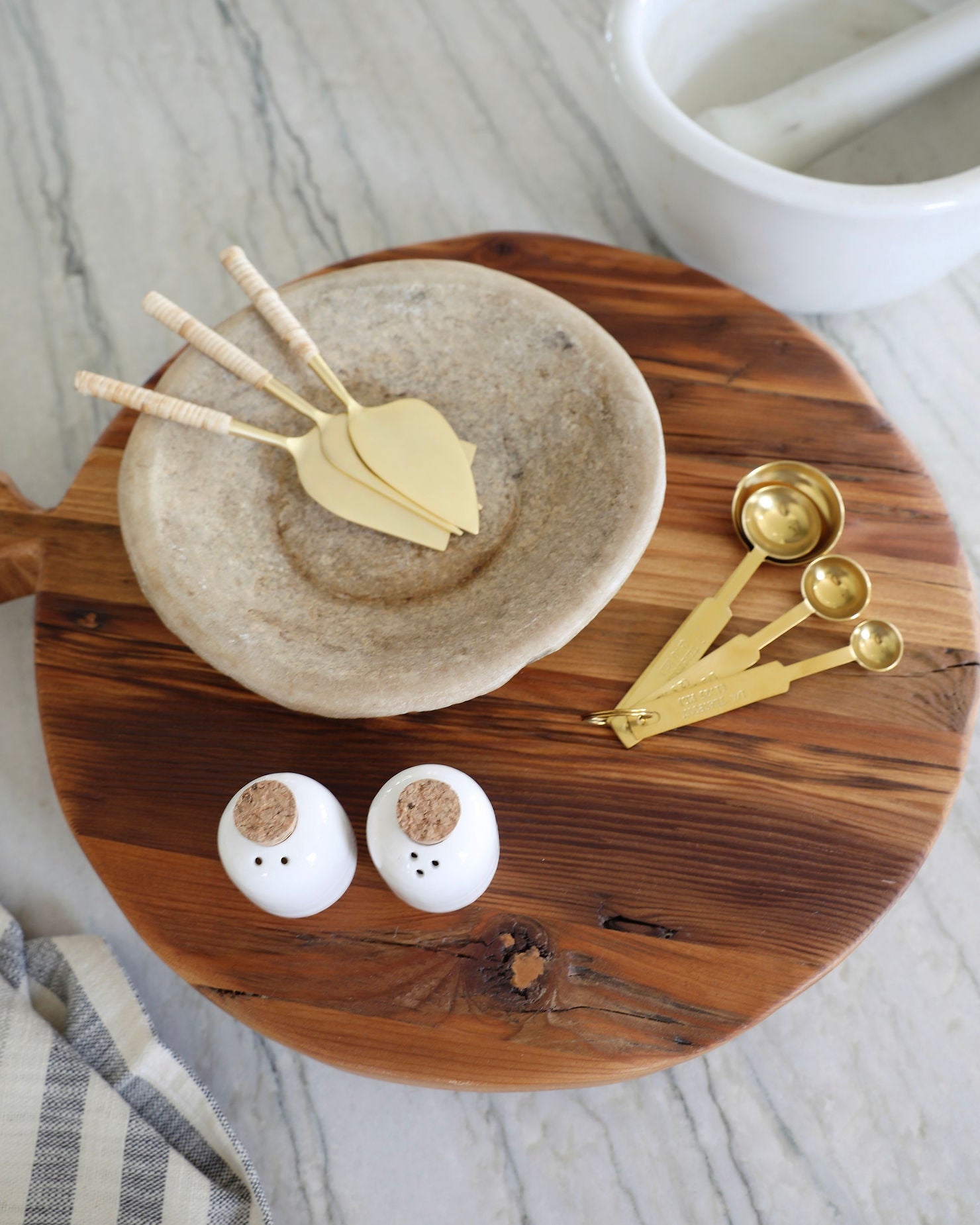 If you’re transitioning to a kitchen without upper cabinets or one with open shelving, I suggest going through your dishes, kitchen accessories, pots, and pans, and purging anything that’s not used regularly, loved, or past its prime. Most kitchens have lower cabinets or a pantry where you can stash those not-so-aesthetically pleasing items that you only use occasionally.