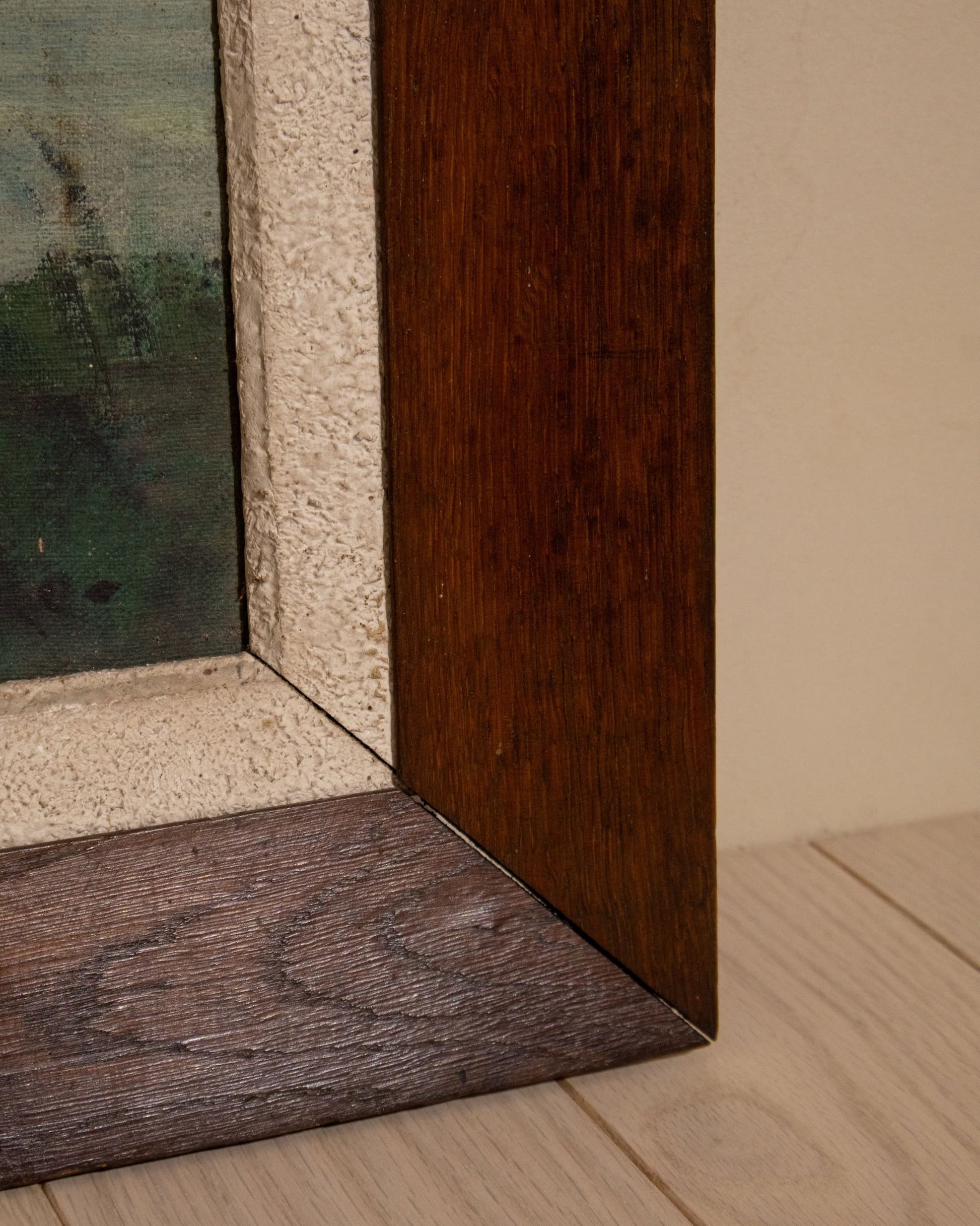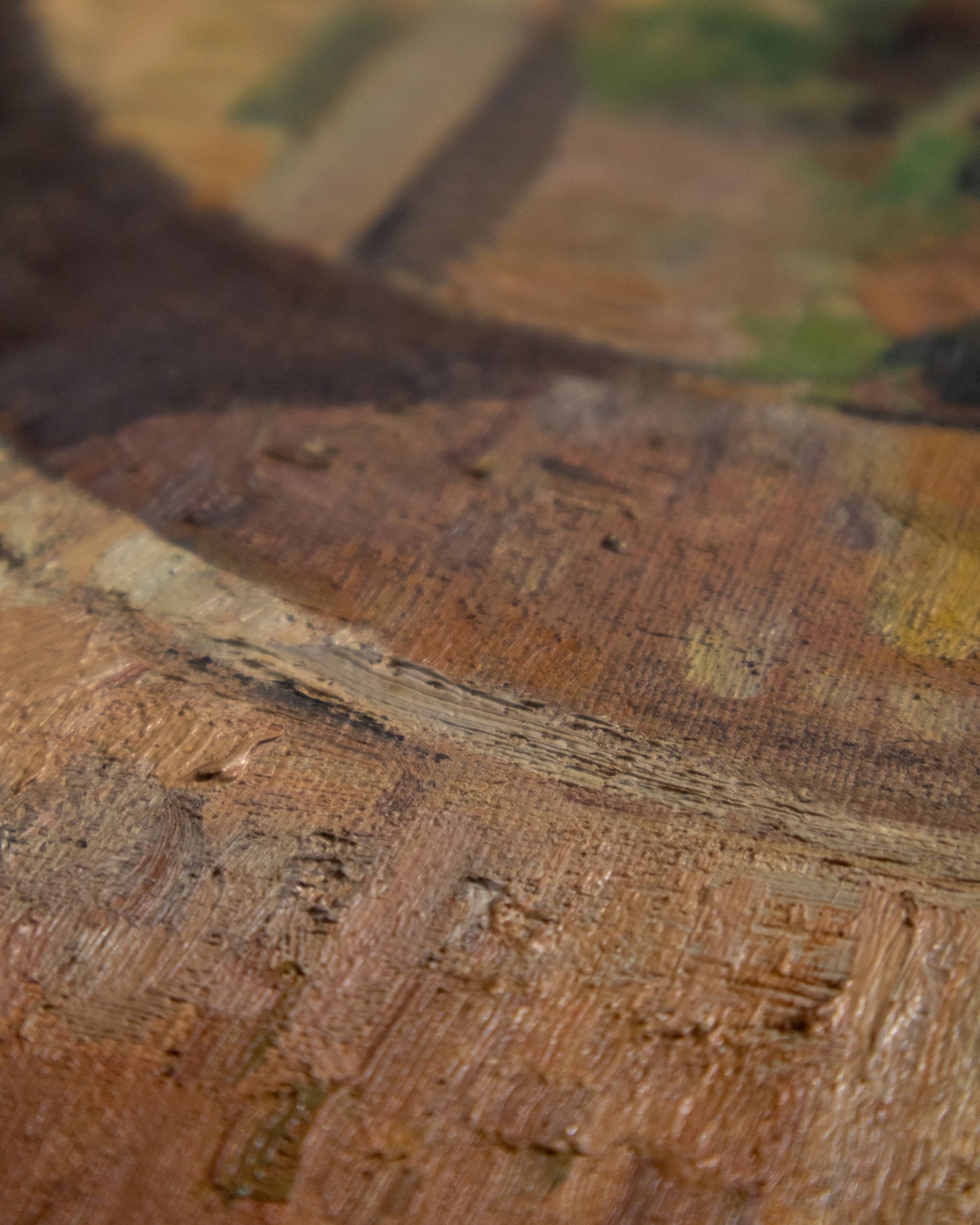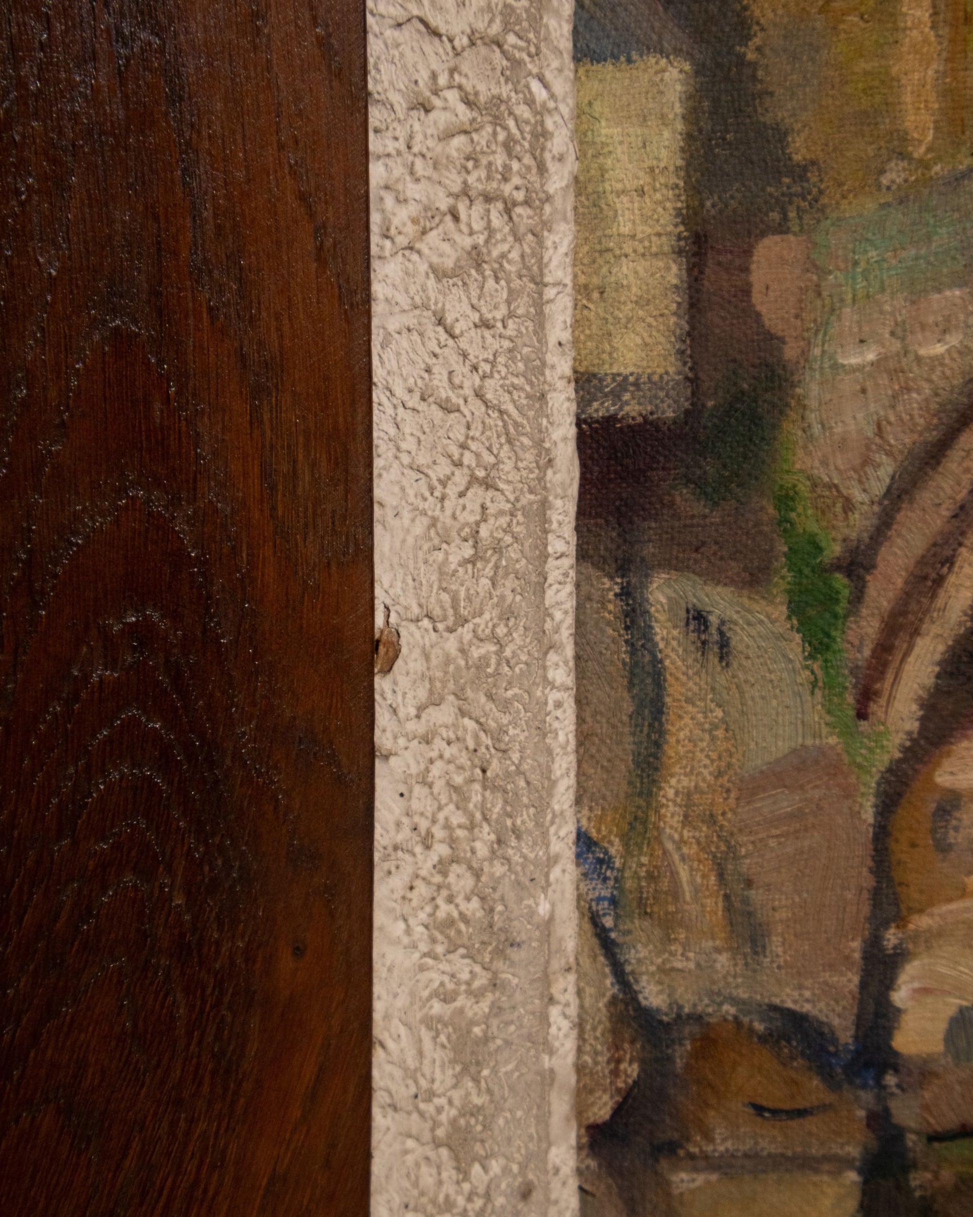 A richly painted European riverscape with arched stonework and mirrored reflections, housed in a textured mat and wood frame.
