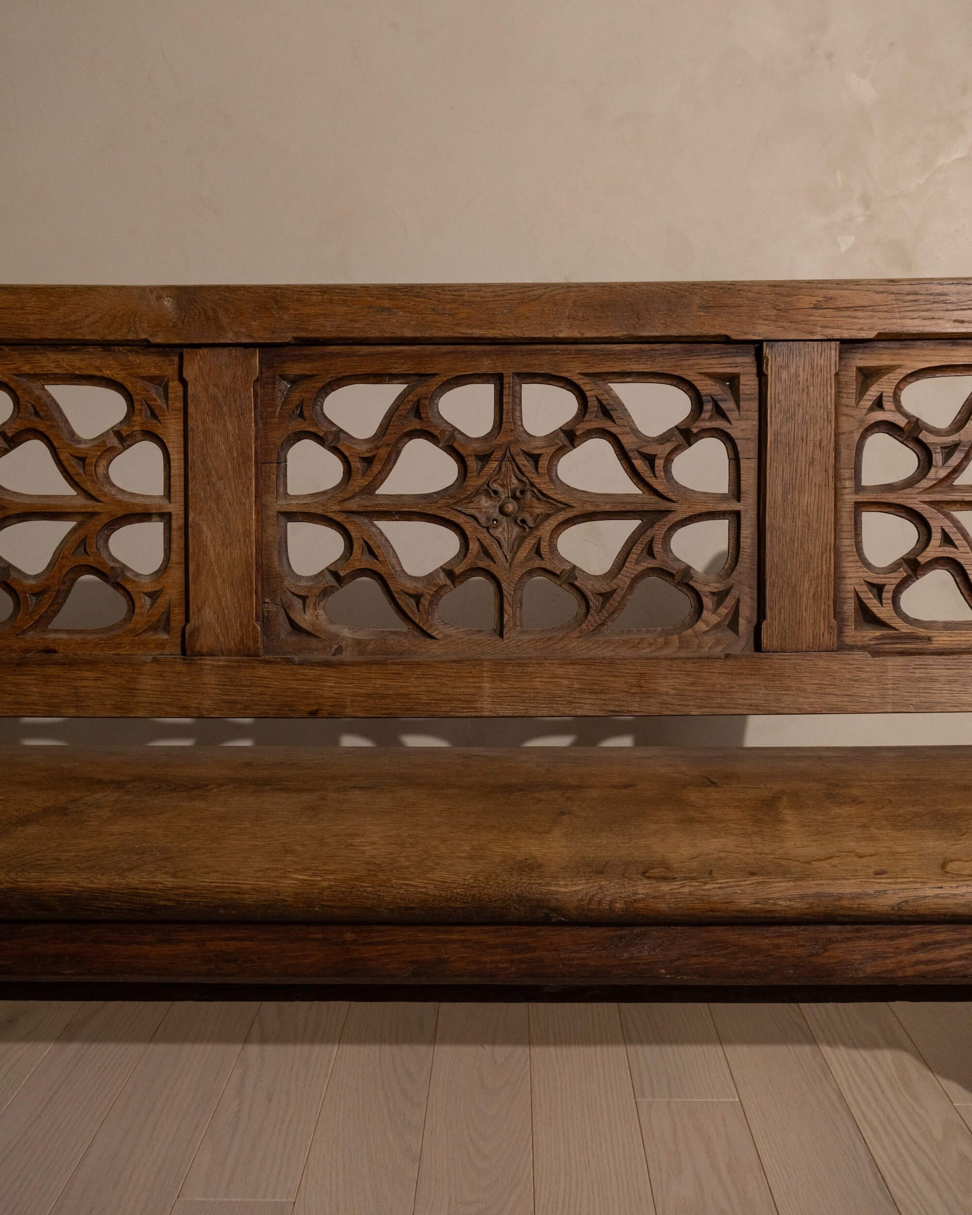A richly detailed 19th-century oak church pew with bold Gothic Revival carvings and dramatic silhouette. Both sculptural and functional, it’s a standout addition to entryways, long hallways, or anywhere a statement piece is called for.