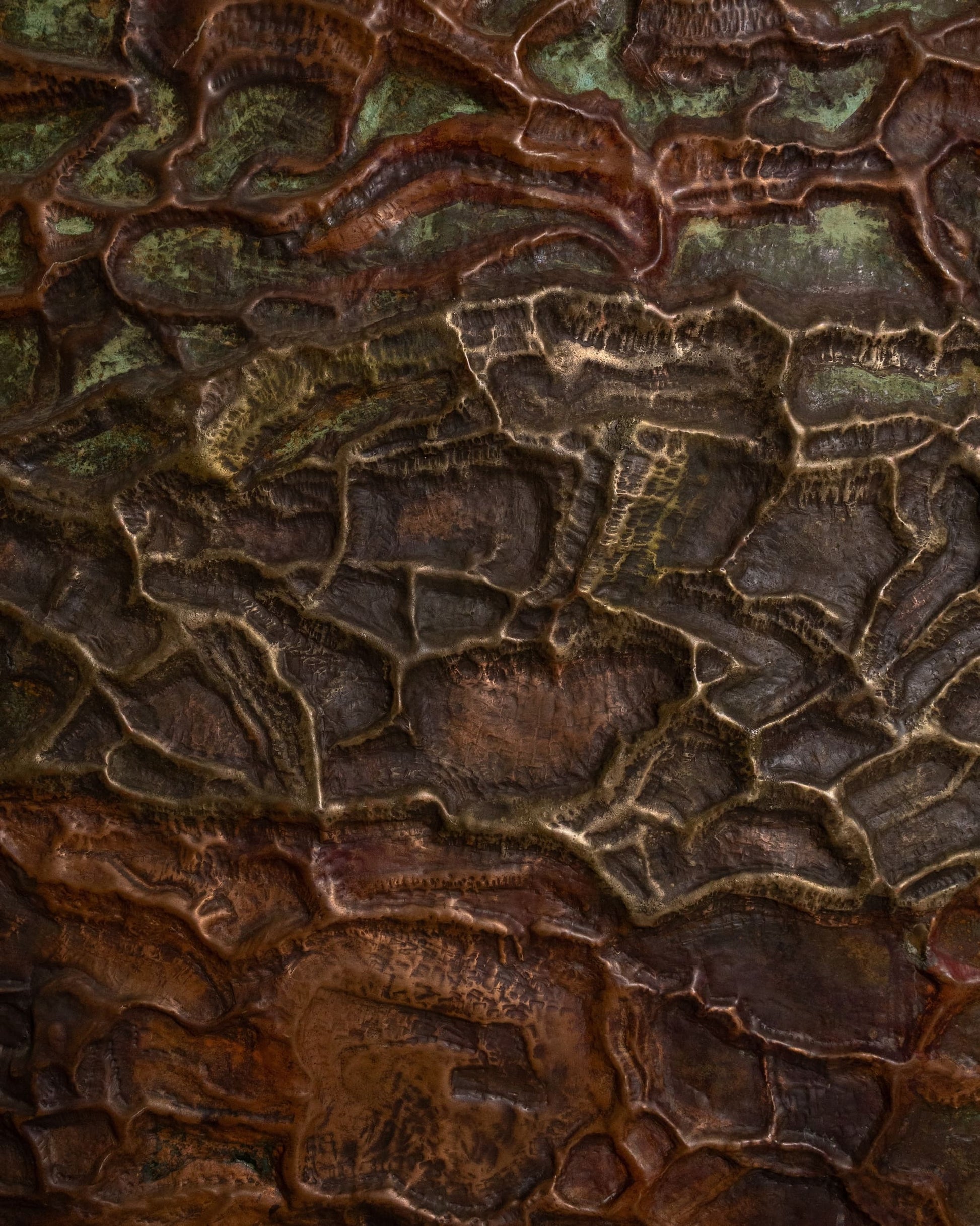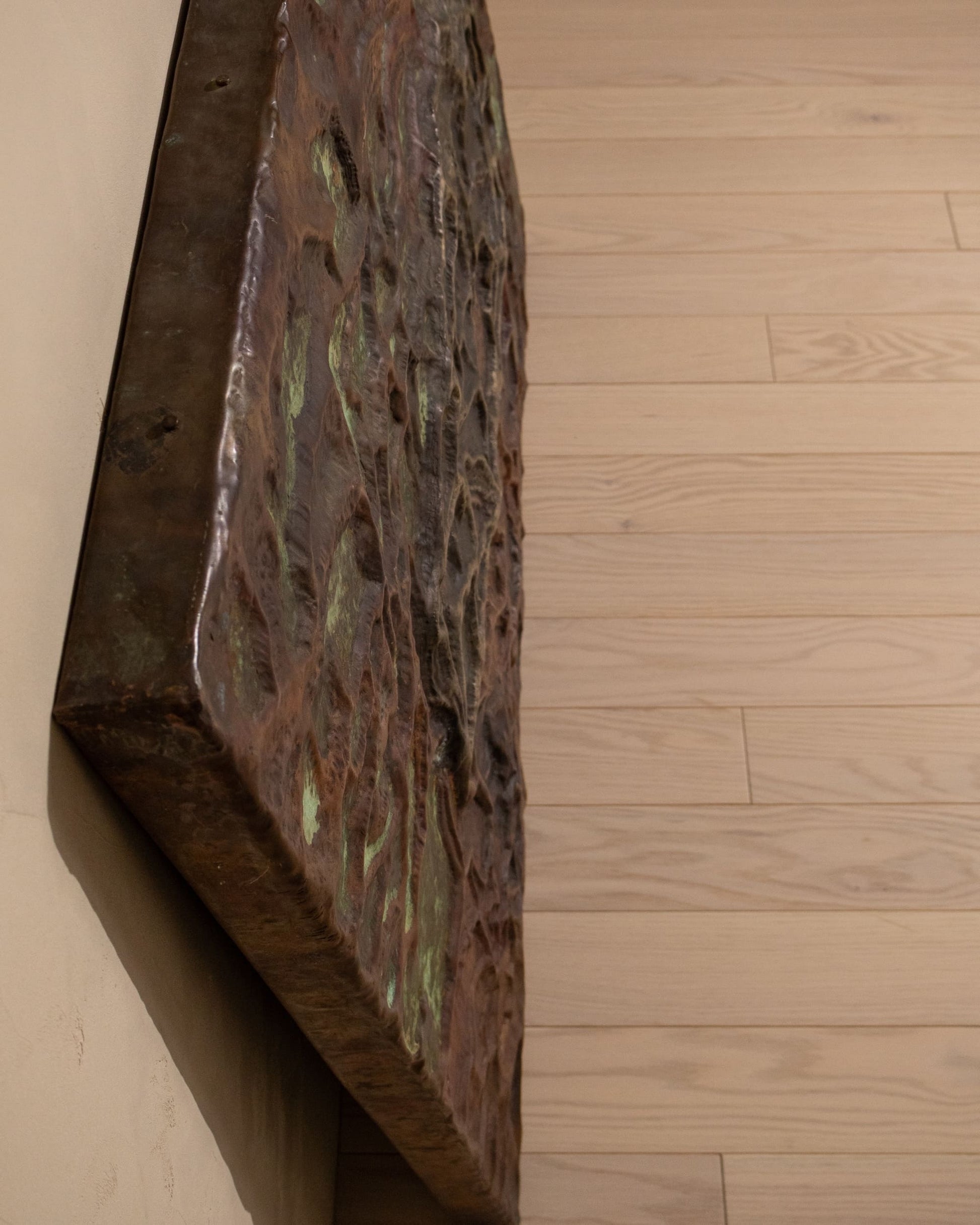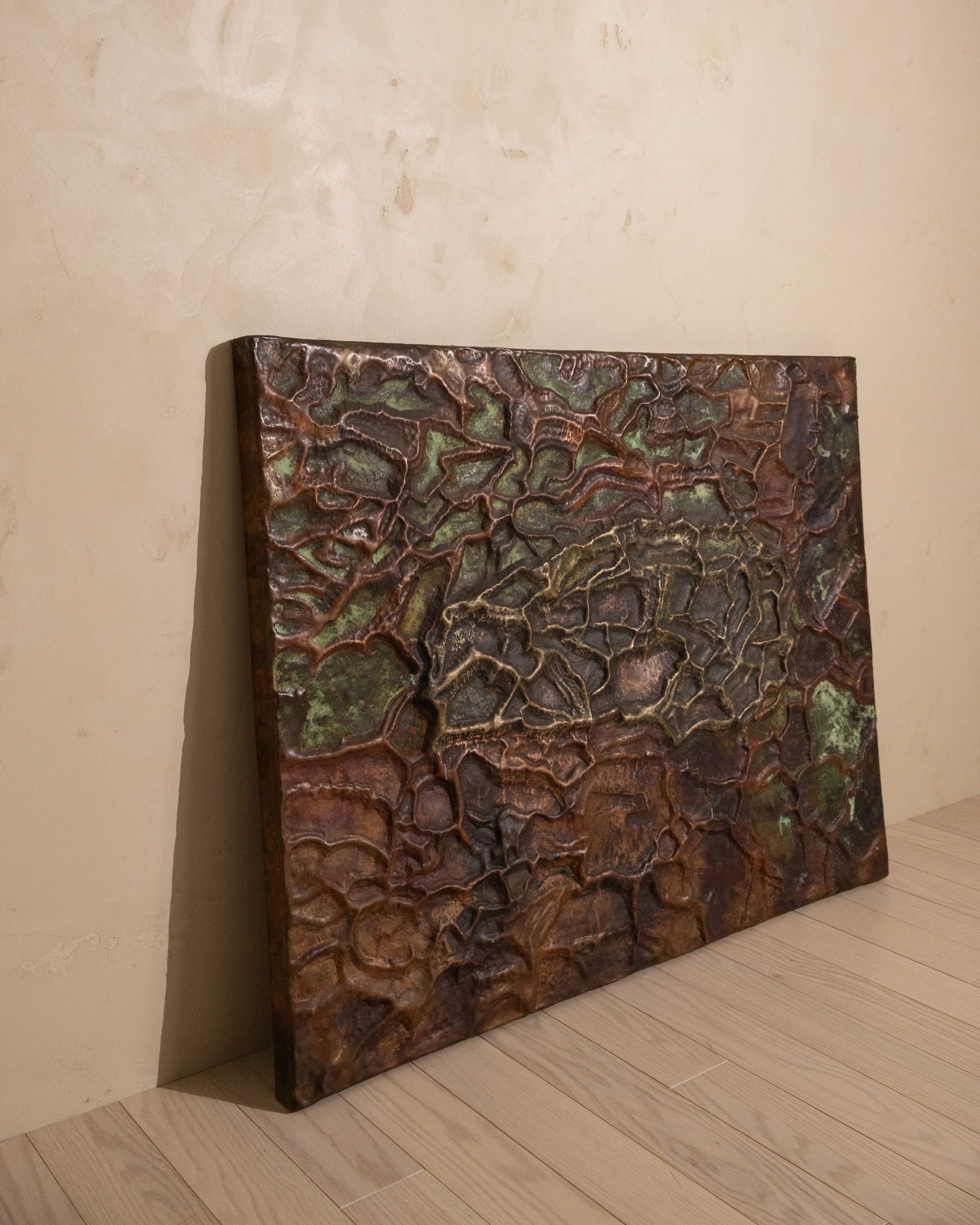 A large 1950s bronze wall hanging with sculpted relief and richly variegated patina. Abstract, textured, and quietly commanding.
