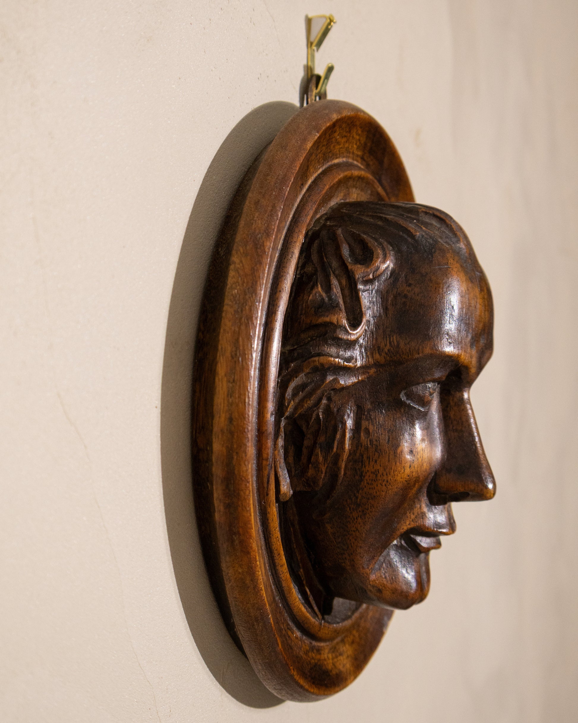 This decorative wall plaque features a deeply carved male bust in profile, sculpted from richly toned wood with a warm, time-earned patina. The figure is encircled within a round border, all carved from the same wood, creating a medallion-like effect that highlights the expressive facial features and stylized hair.