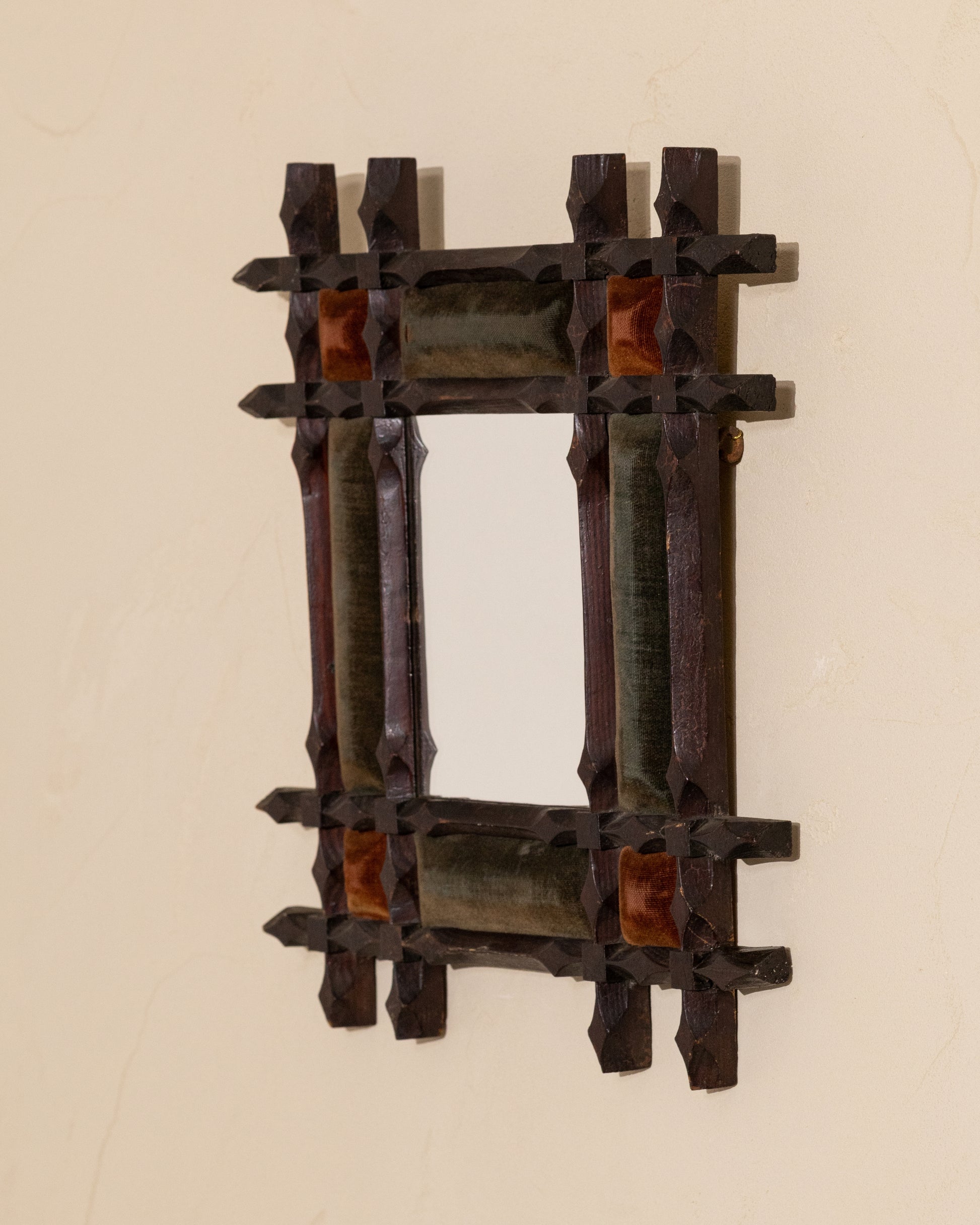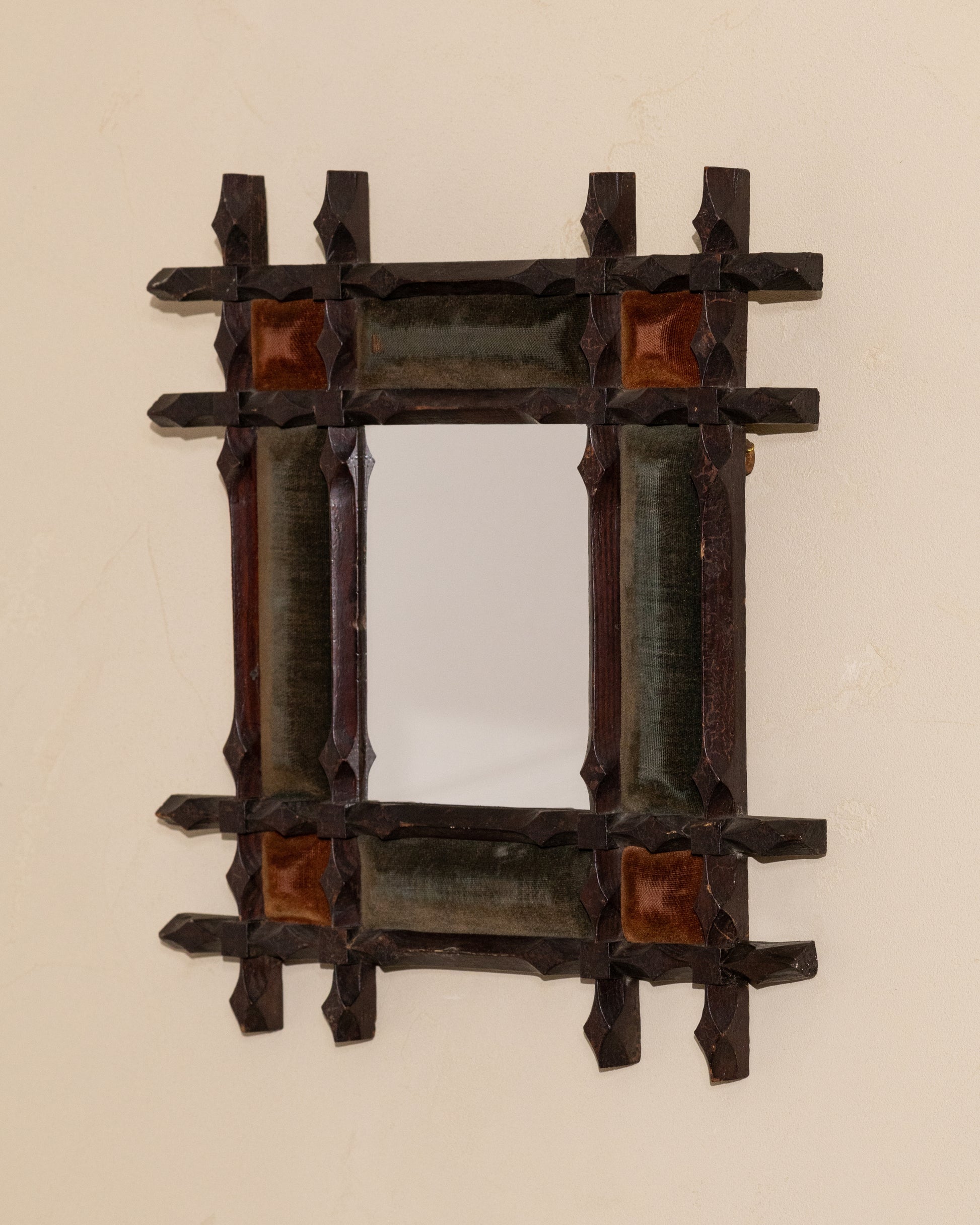 This small 19th-century mirror combines intricate chip-carved detailing with velvet cushion panels in rust and aged olive green. The carving retains its original dark finish with a natural, undisturbed patina. The velvet shows the soft wear, tonal variation, and fading expected of early textile work, all of which contribute to the mirror’s charm and rarity.