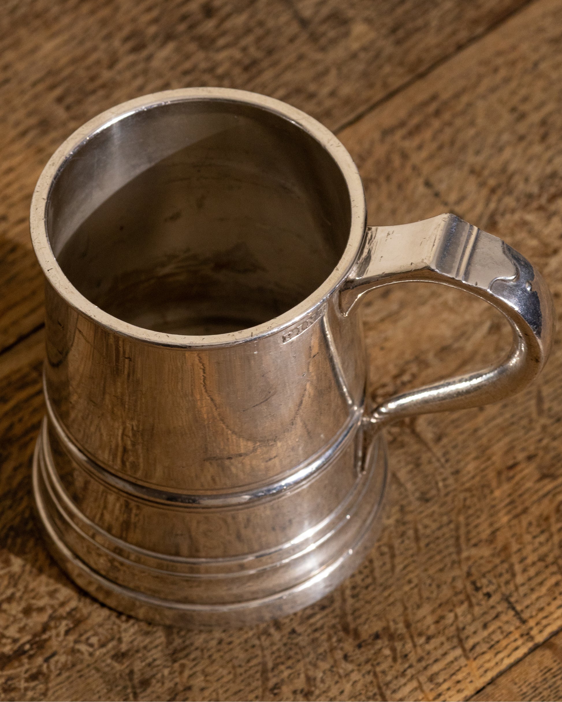 Good vintage condition with expected wear from age and use. Surface scratches, small marks, and gentle plating rub are present throughout, consistent with well-loved pub tankards. Handle and form remain sturdy and attractive. Not recommended for food or beverage use.
