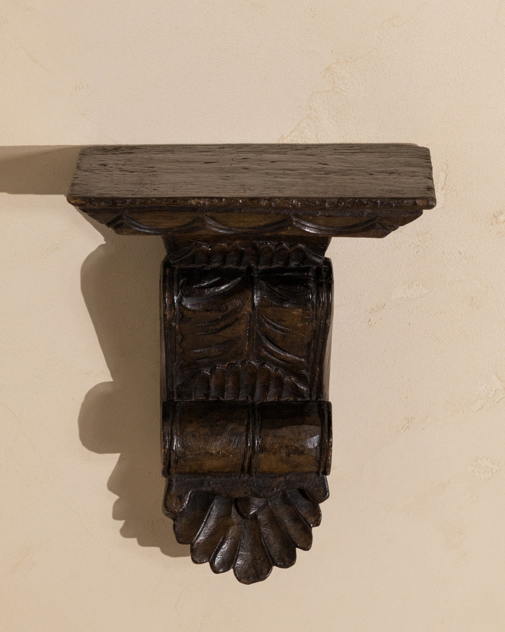 A sculptural carved wooden wall shelf with rich patina and architectural presence — a character-filled accent for layering depth into any space.