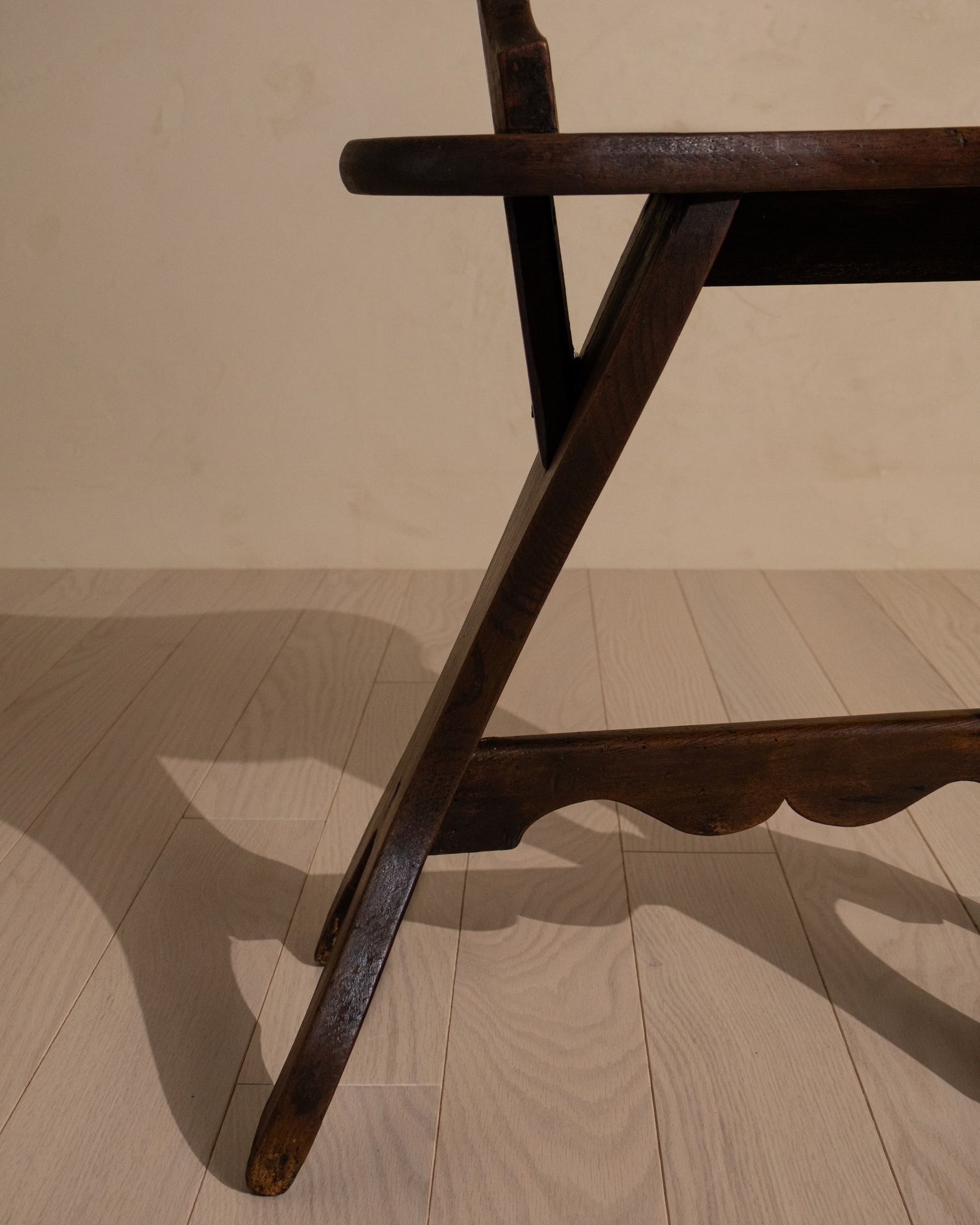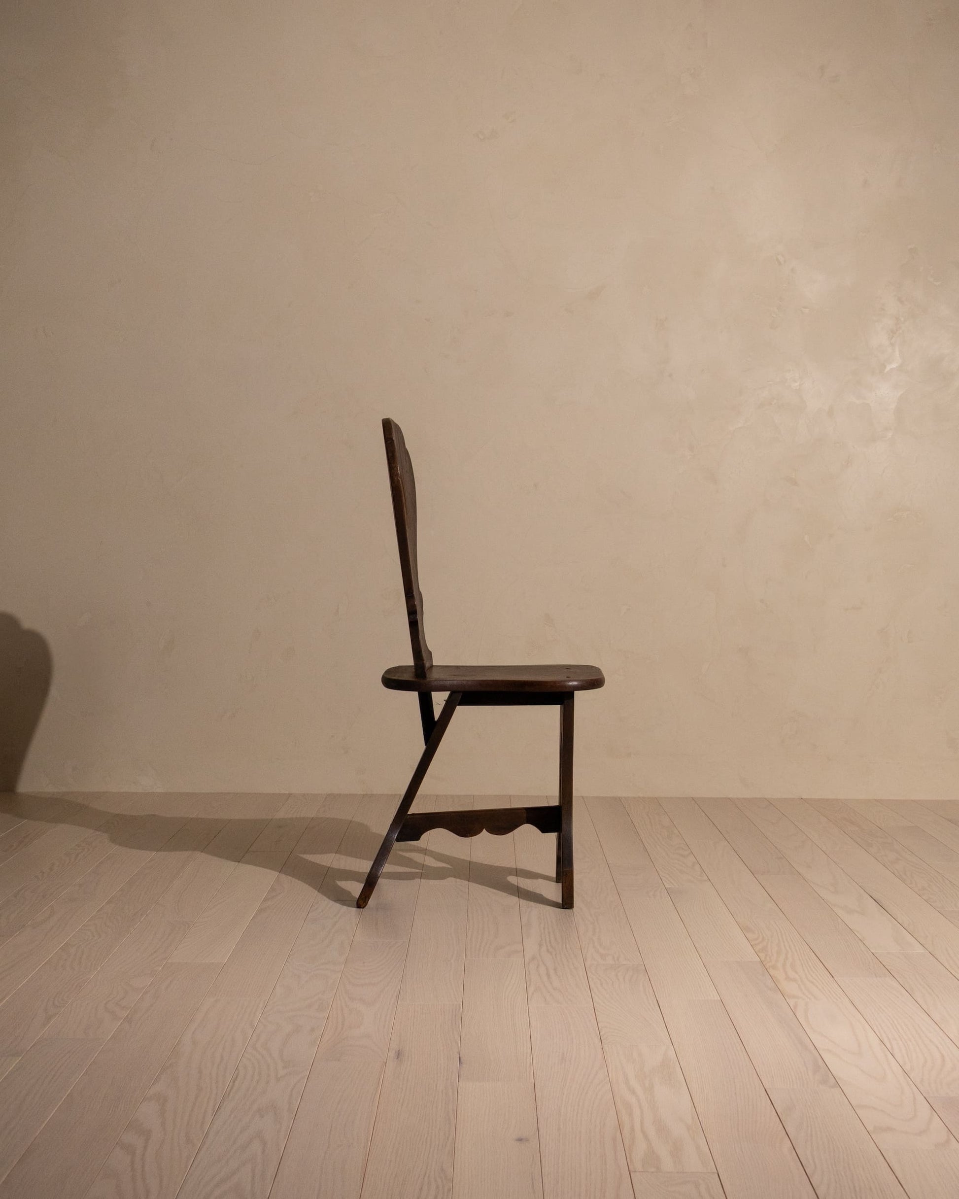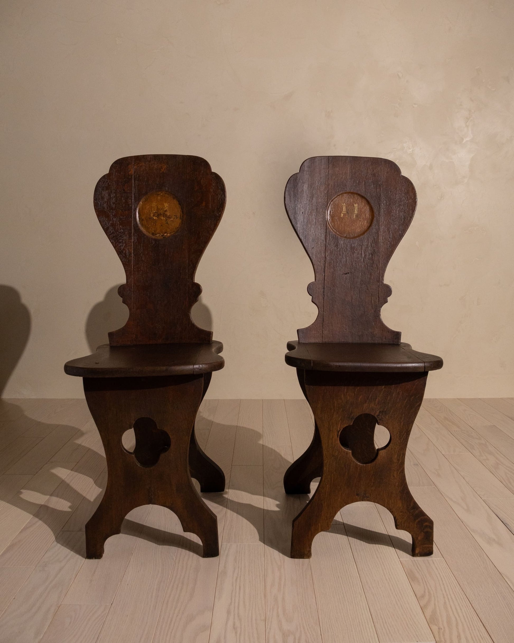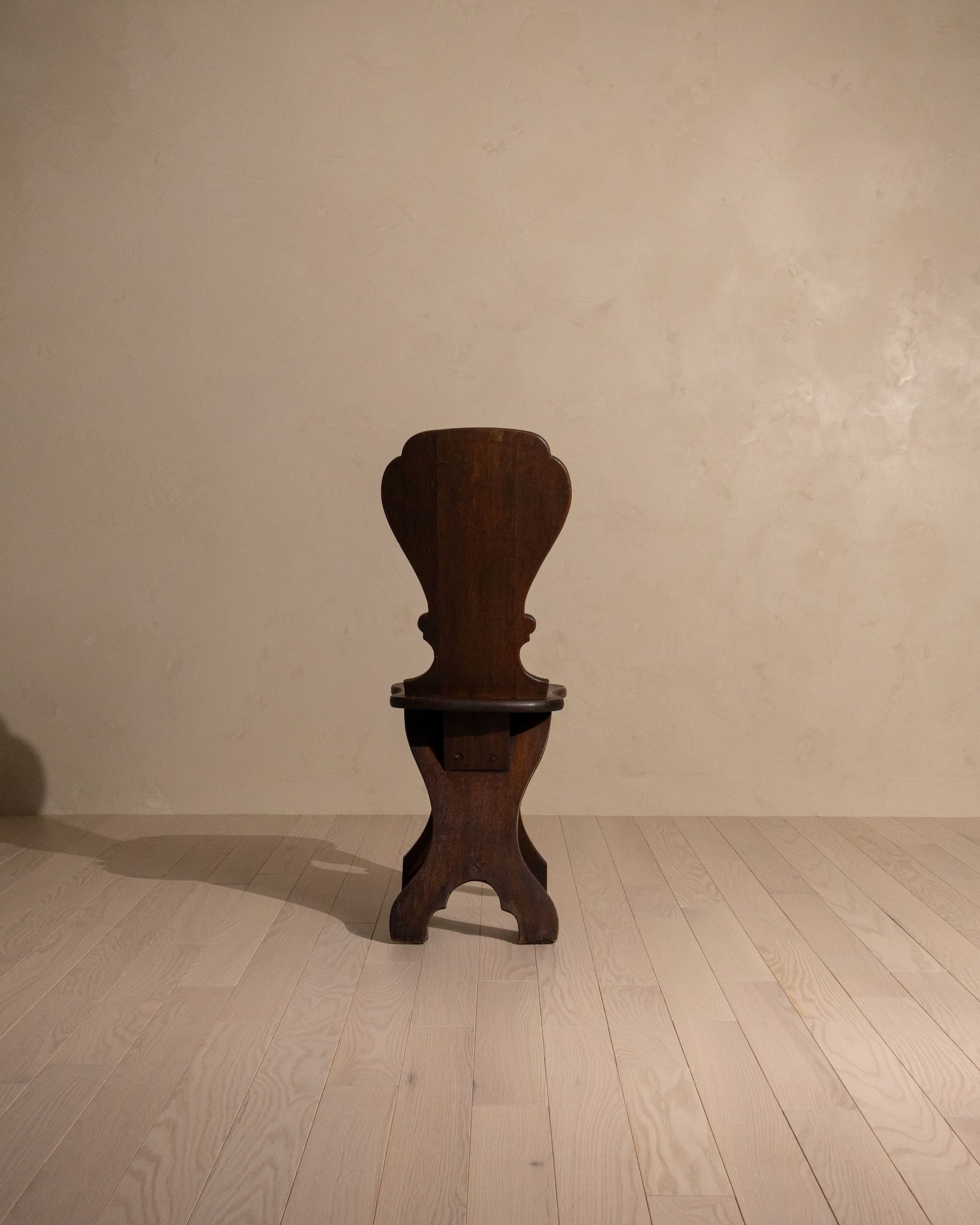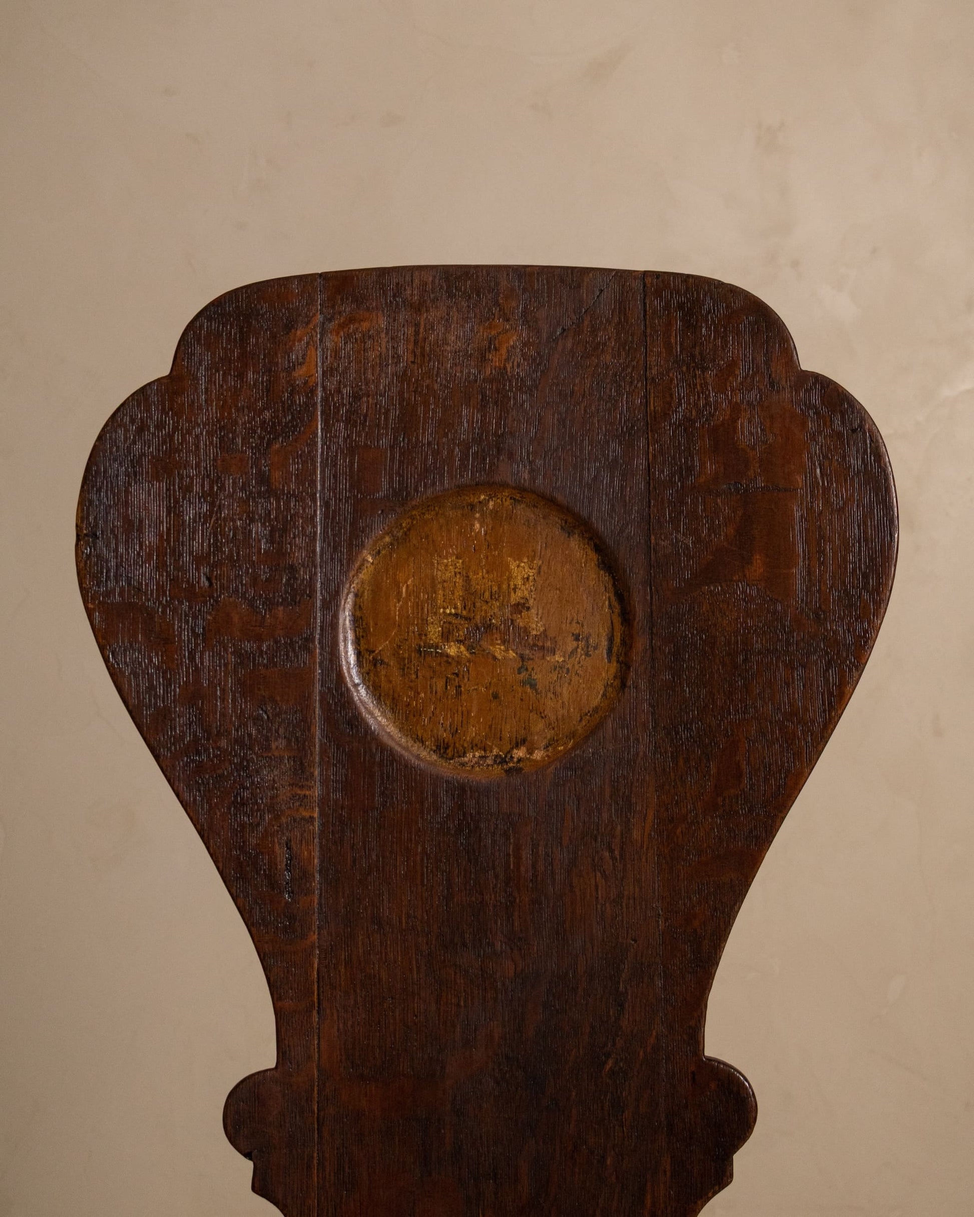 An early 19th-century English oak hall chair with a shapely silhouette and central painted insignia. Sculptural in form, and gently reinforced and restored.