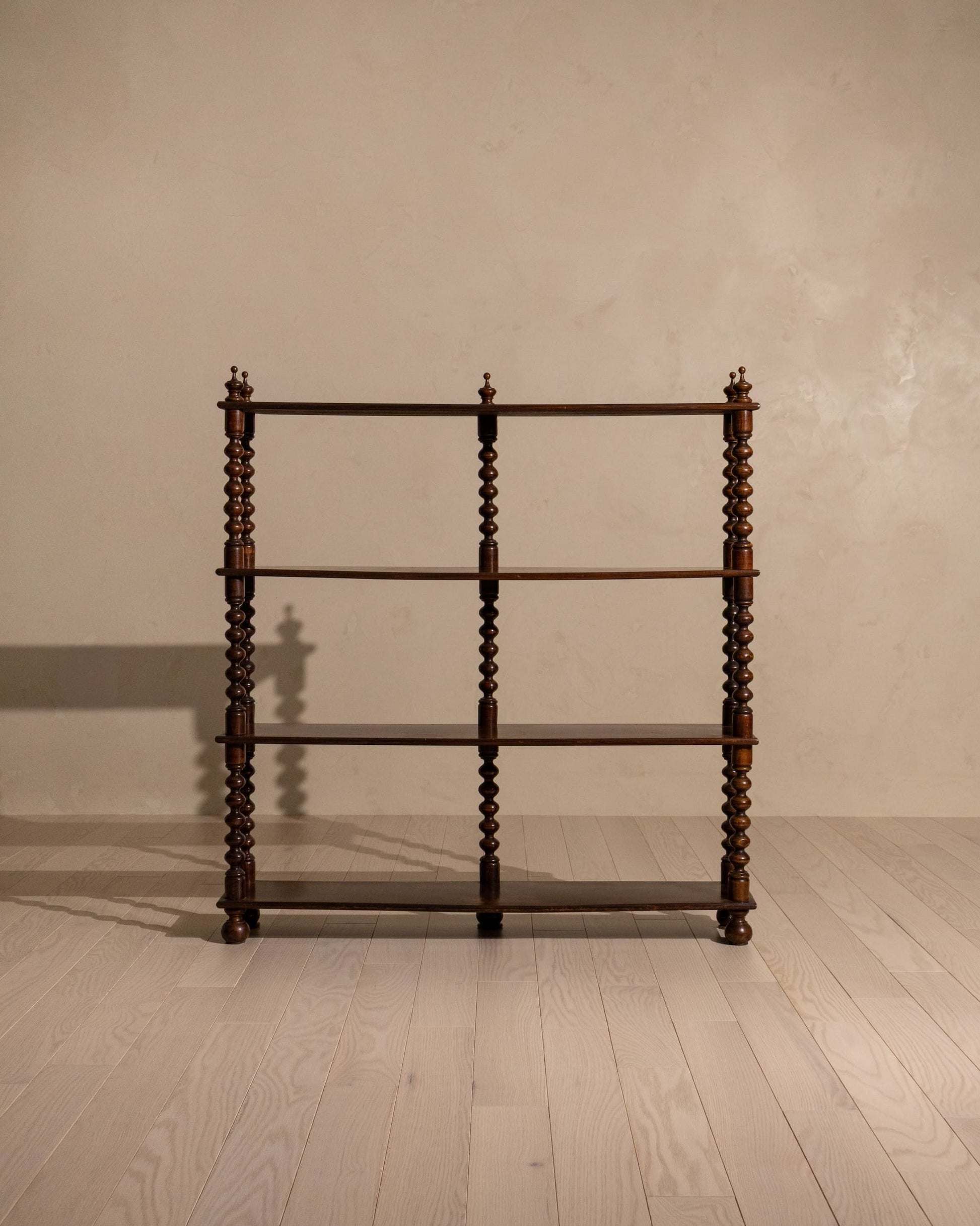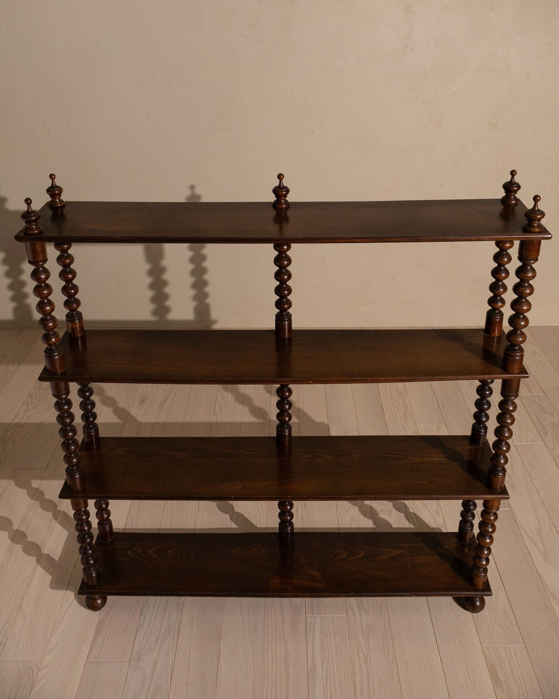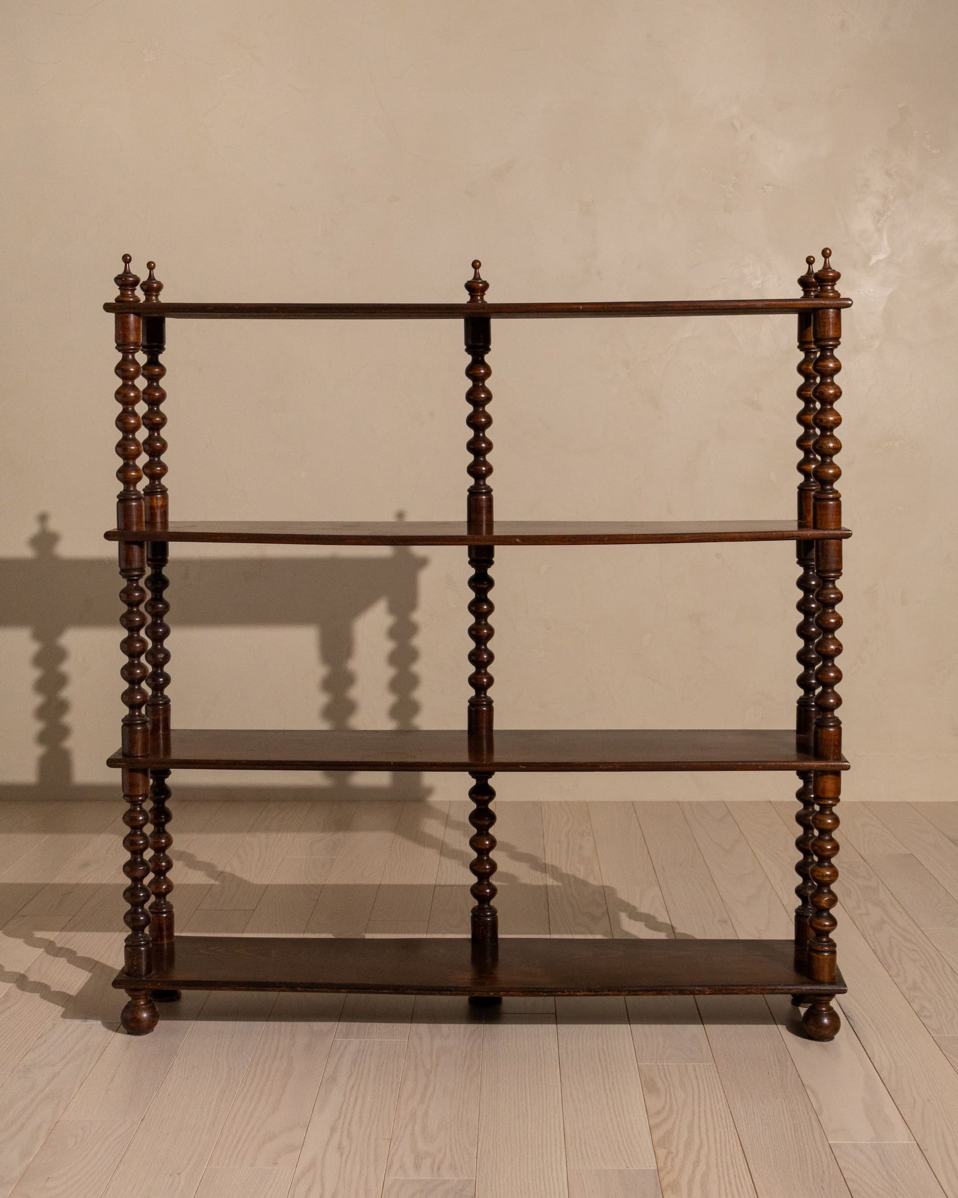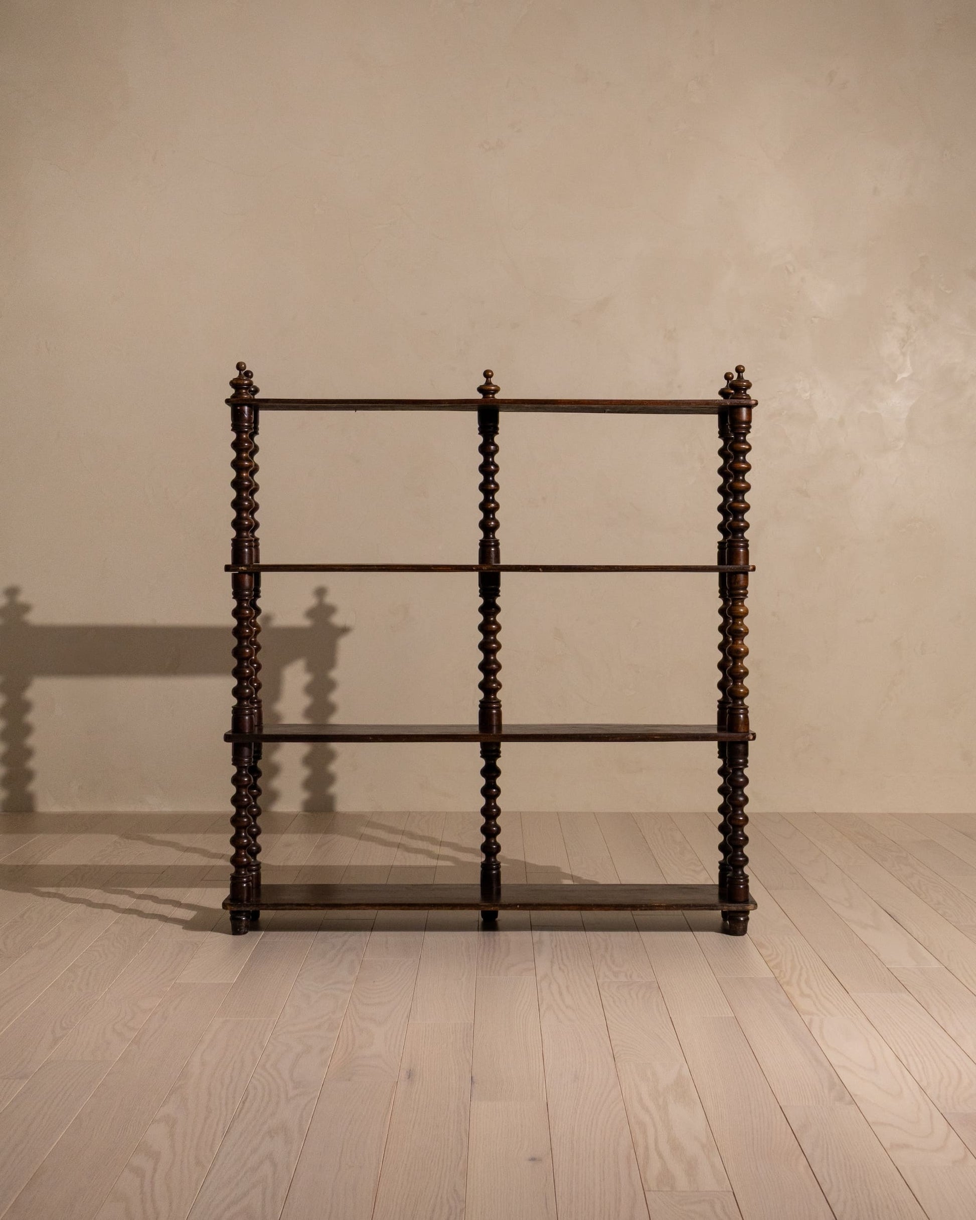 French antique oak bobbin bookcase with turned detailing and a narrow profile. Two available; sold individually.