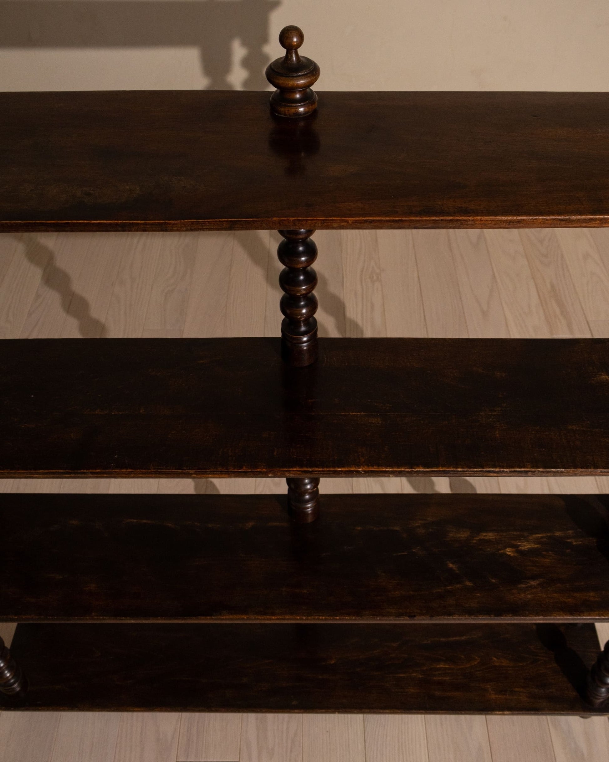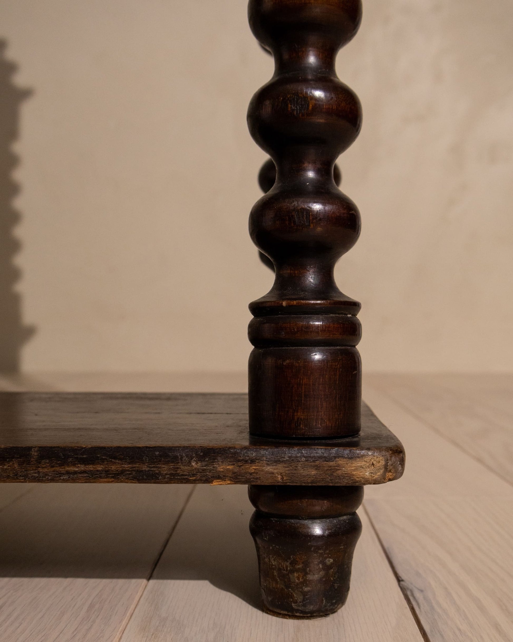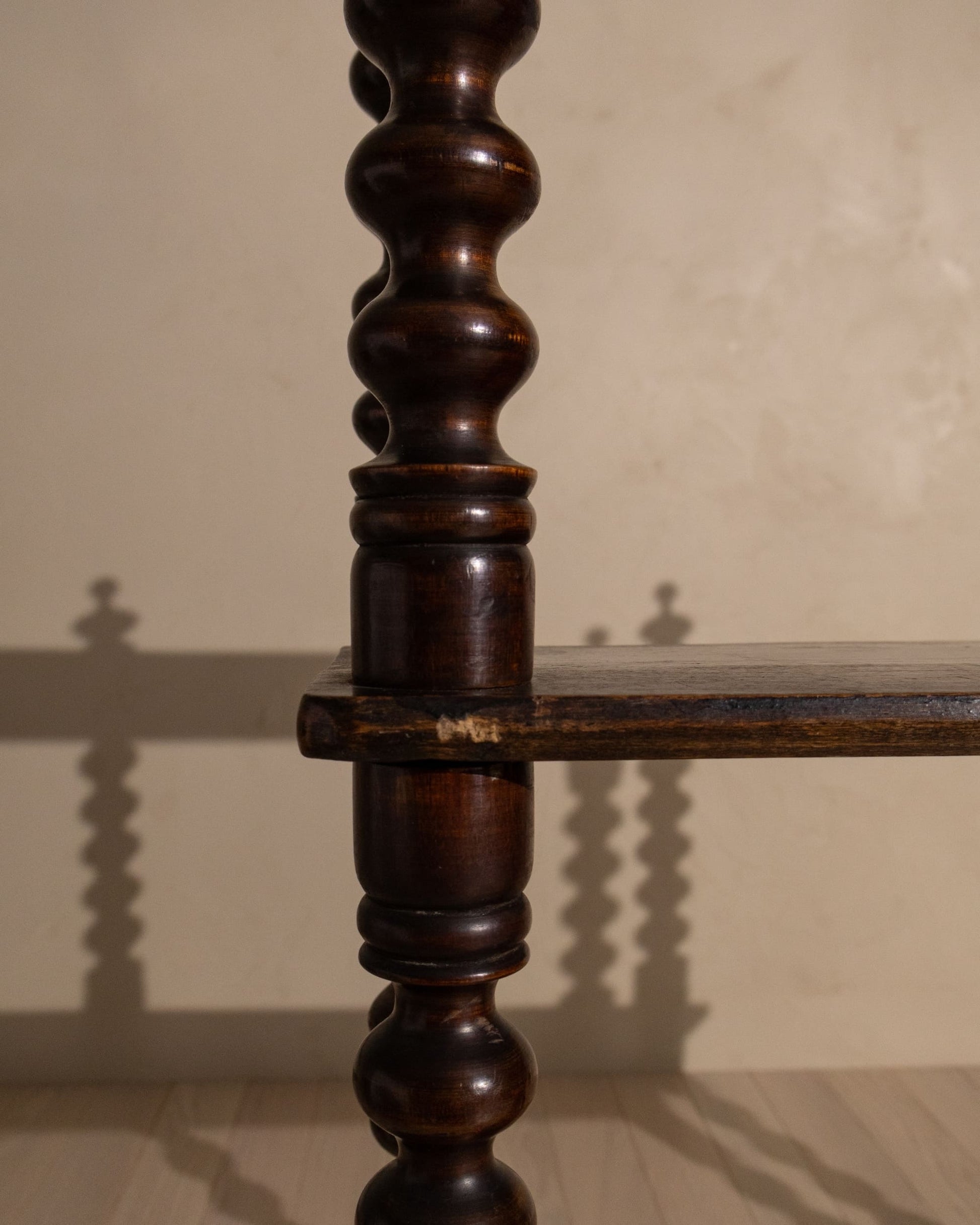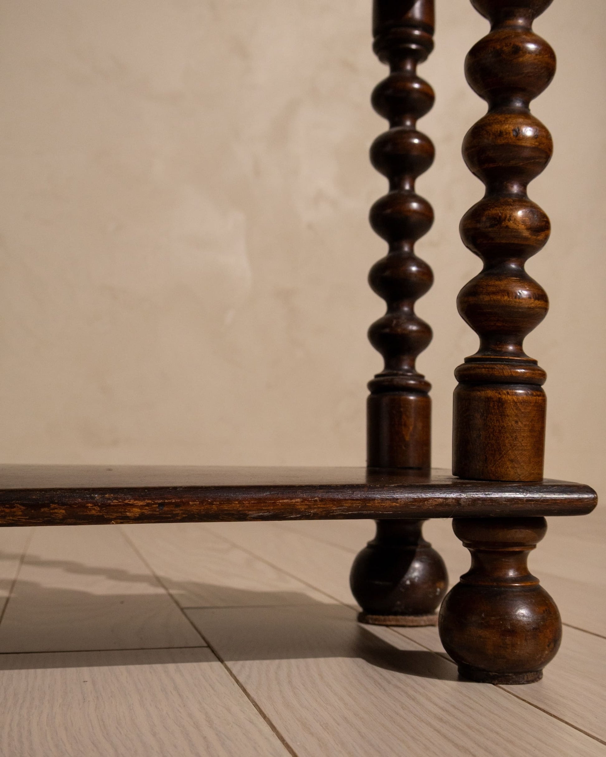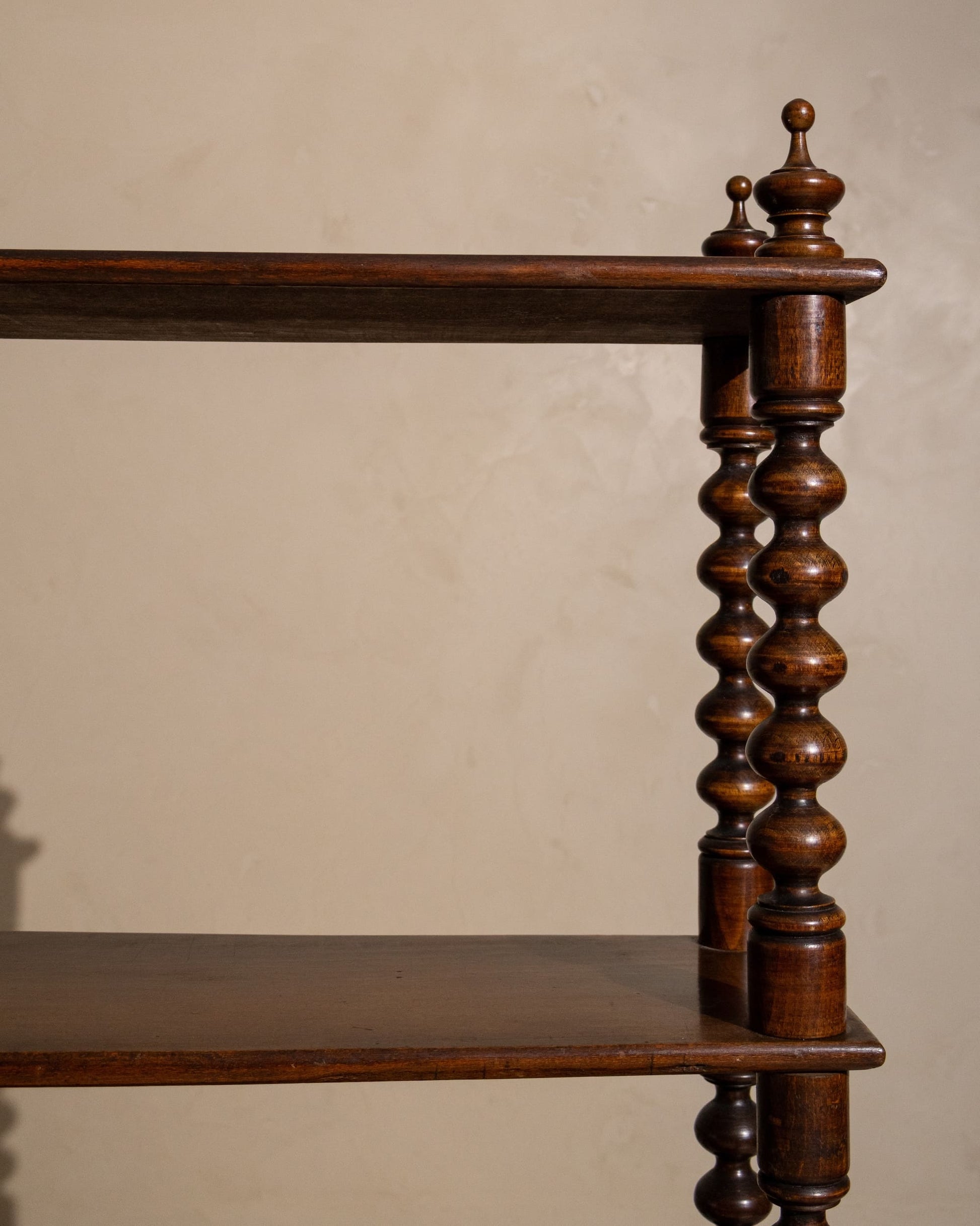 French antique oak bobbin bookcase with turned detailing and a narrow profile. Two available; sold individually.
