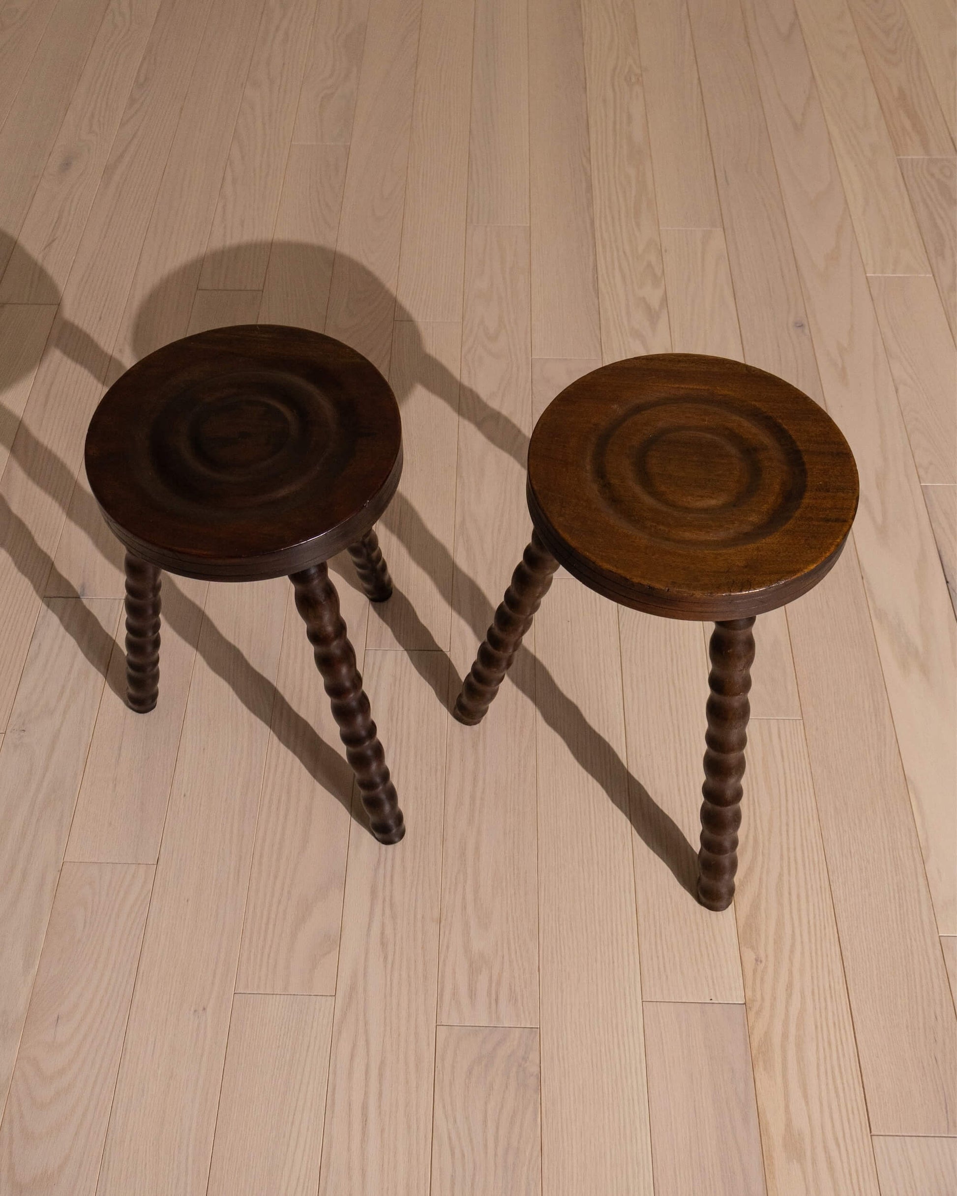 This vintage French stool offers sculptural appeal in a compact, versatile form. Each piece features a circular seat with concentric carved rings and three bobbin-turned legs in a tripod base. Petite in scale, it functions beautifully as a side perch, plant stand, or layered decorative accent.