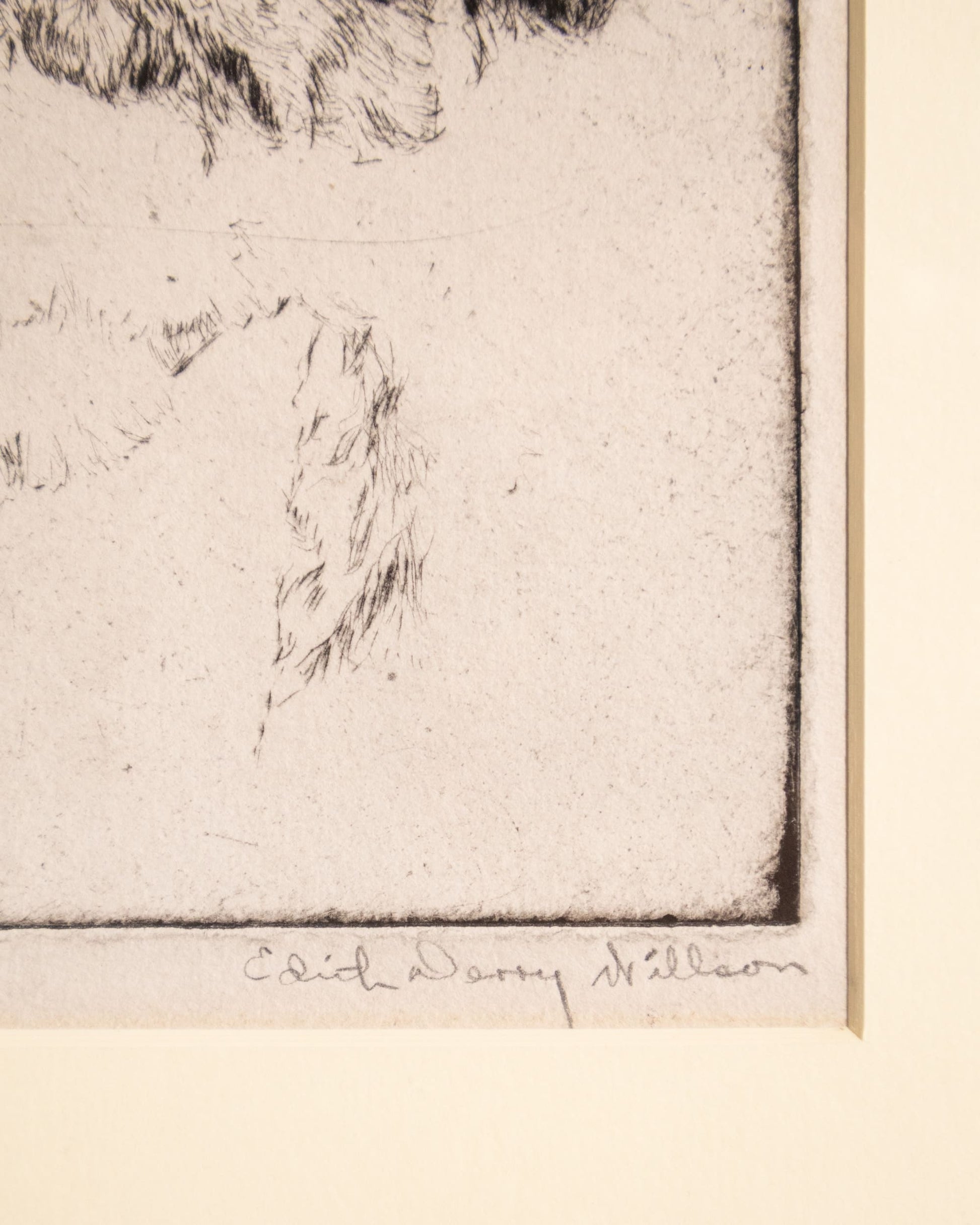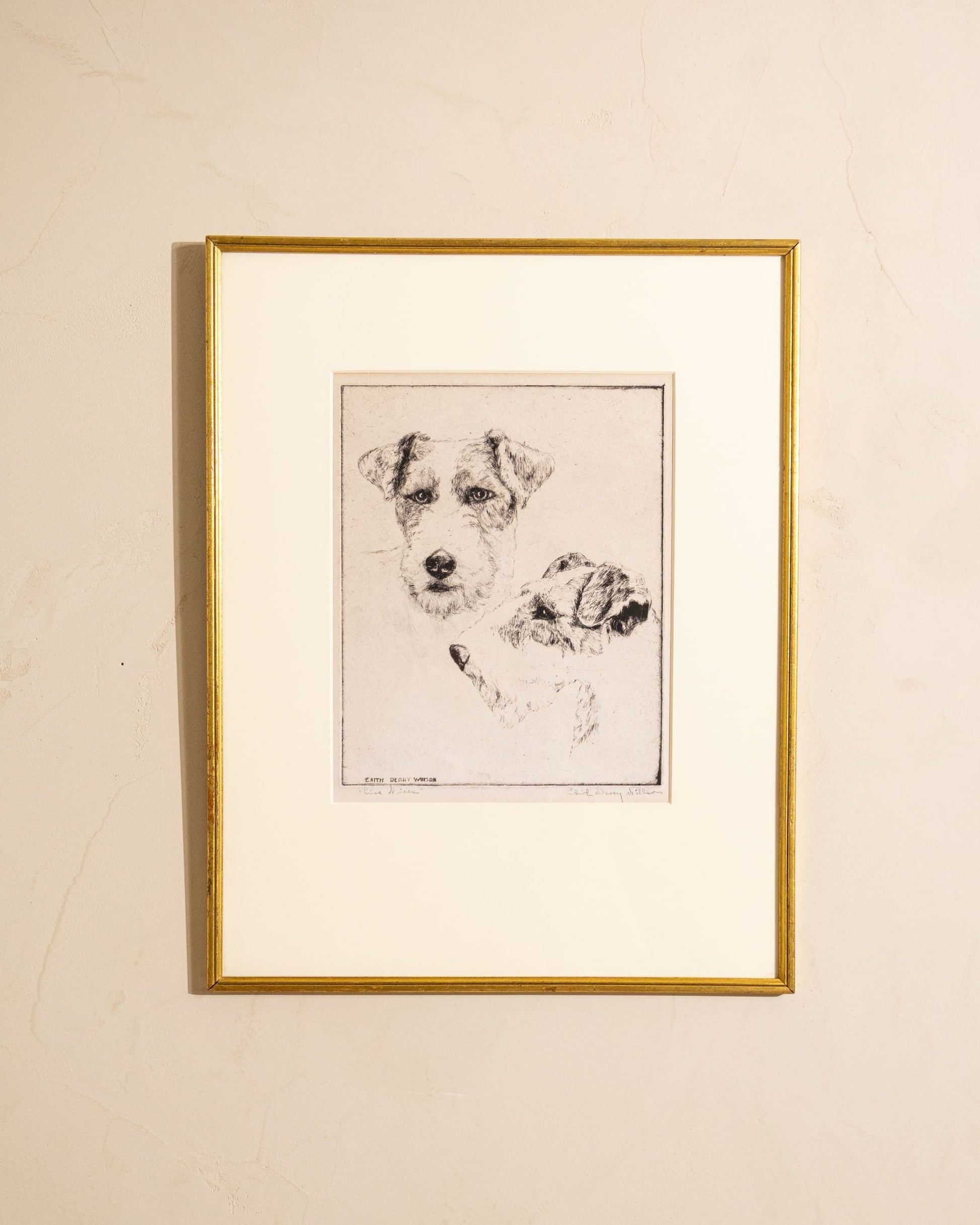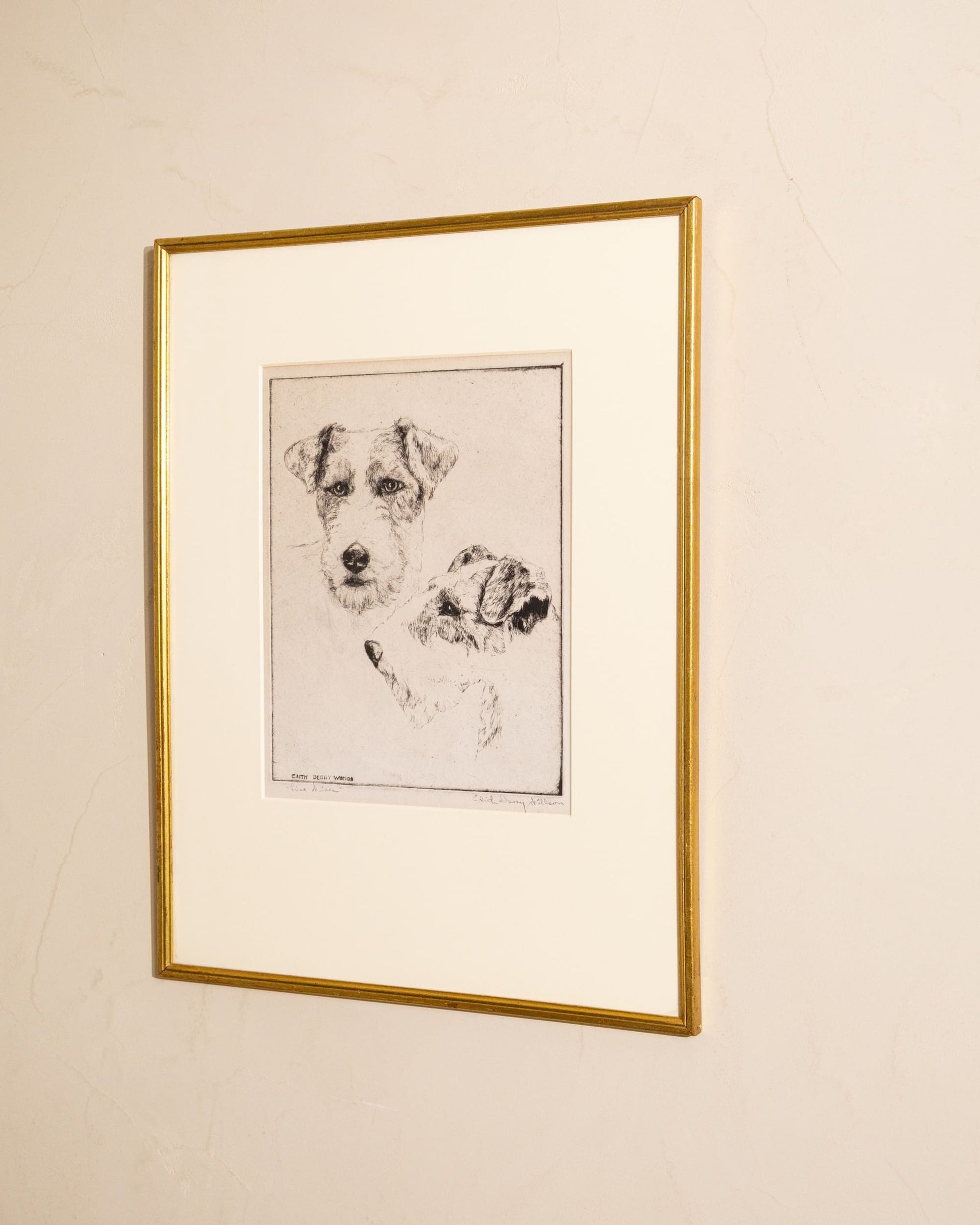 An original etching by American artist Edith Derry Willson, Live Wires features two finely rendered wire fox terriers, their expressions full of character and detail. The work is signed and titled in pencil in the lower margin, and presented behind glass in a thin gilt frame with a wide archival mat.