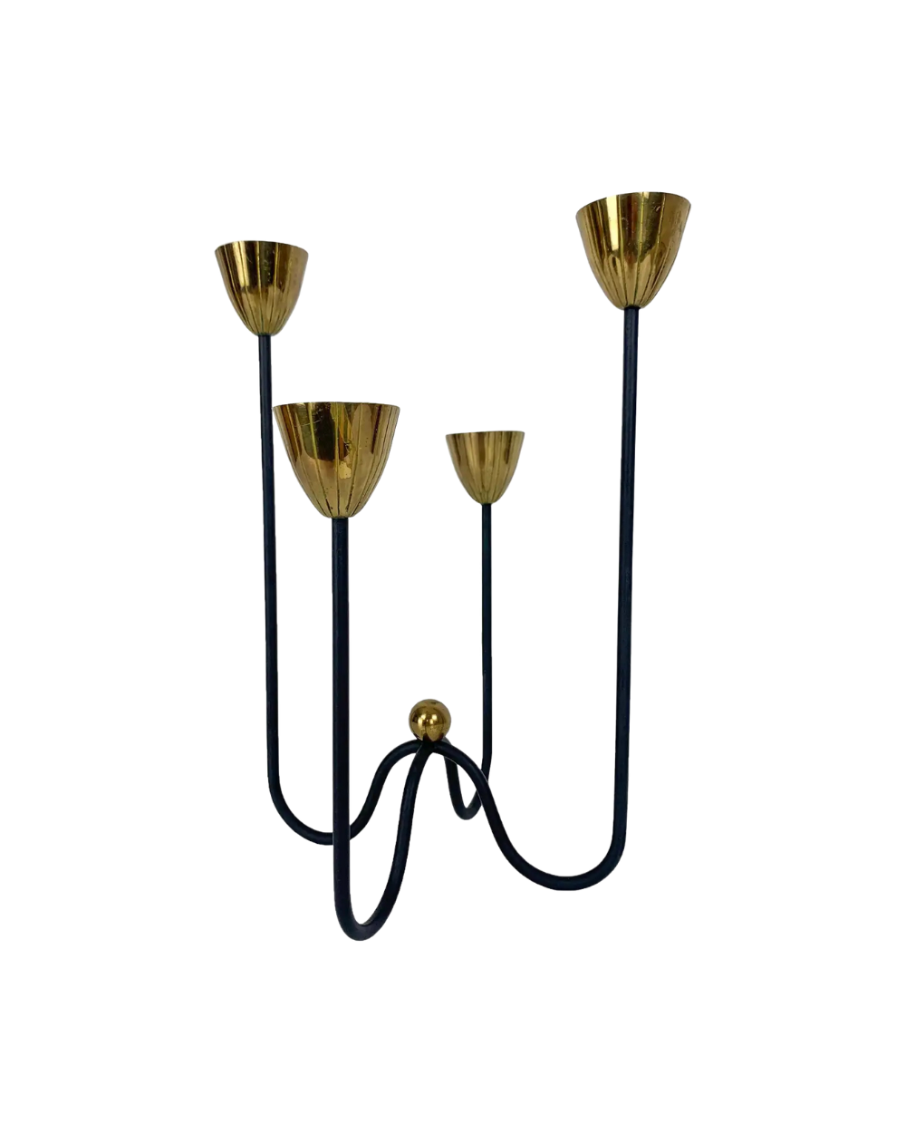 Swedish Modernist candle holder by Gunnar Ander. Stylised flowers in brass on 4 asymmetrical black enameled steel arms.