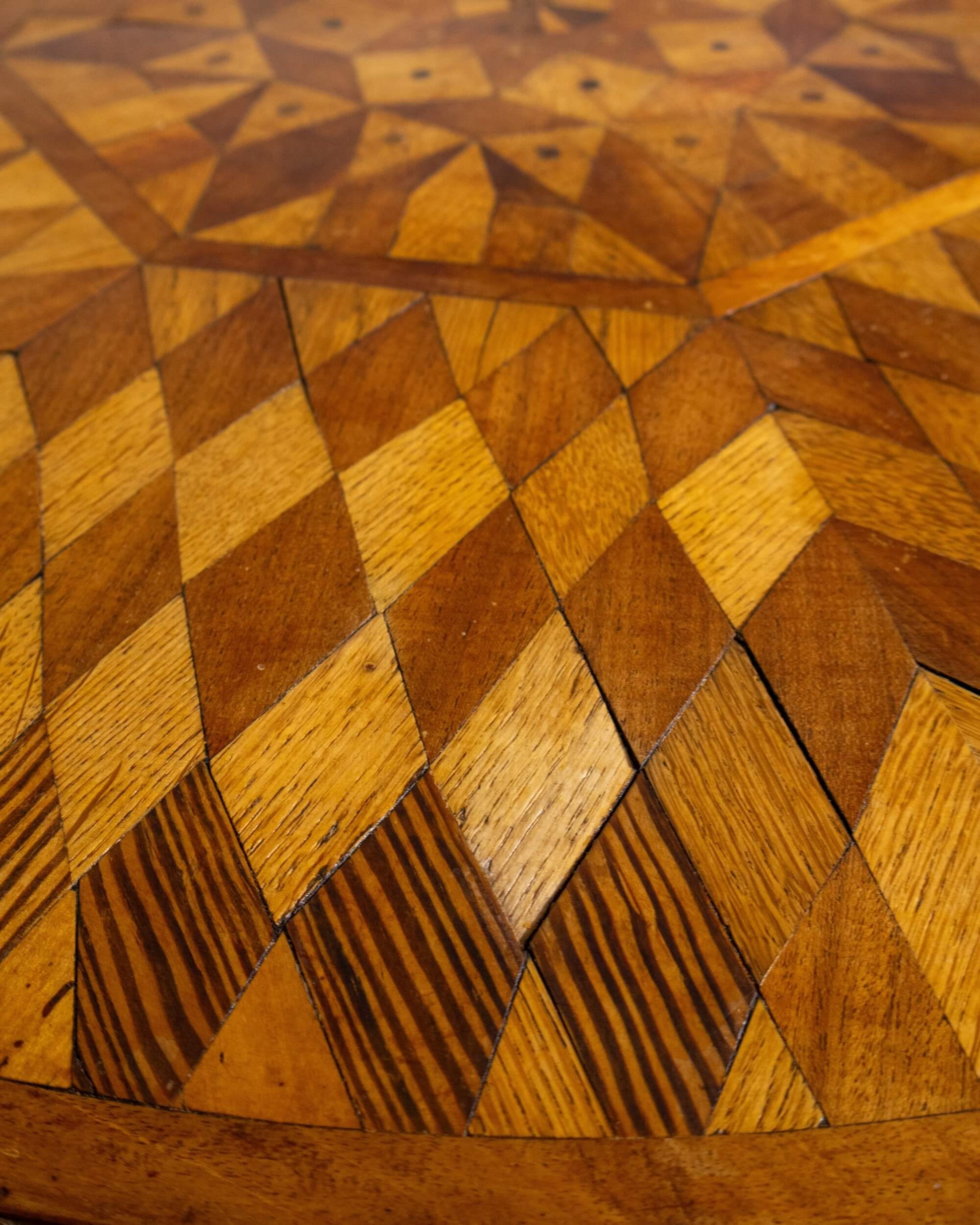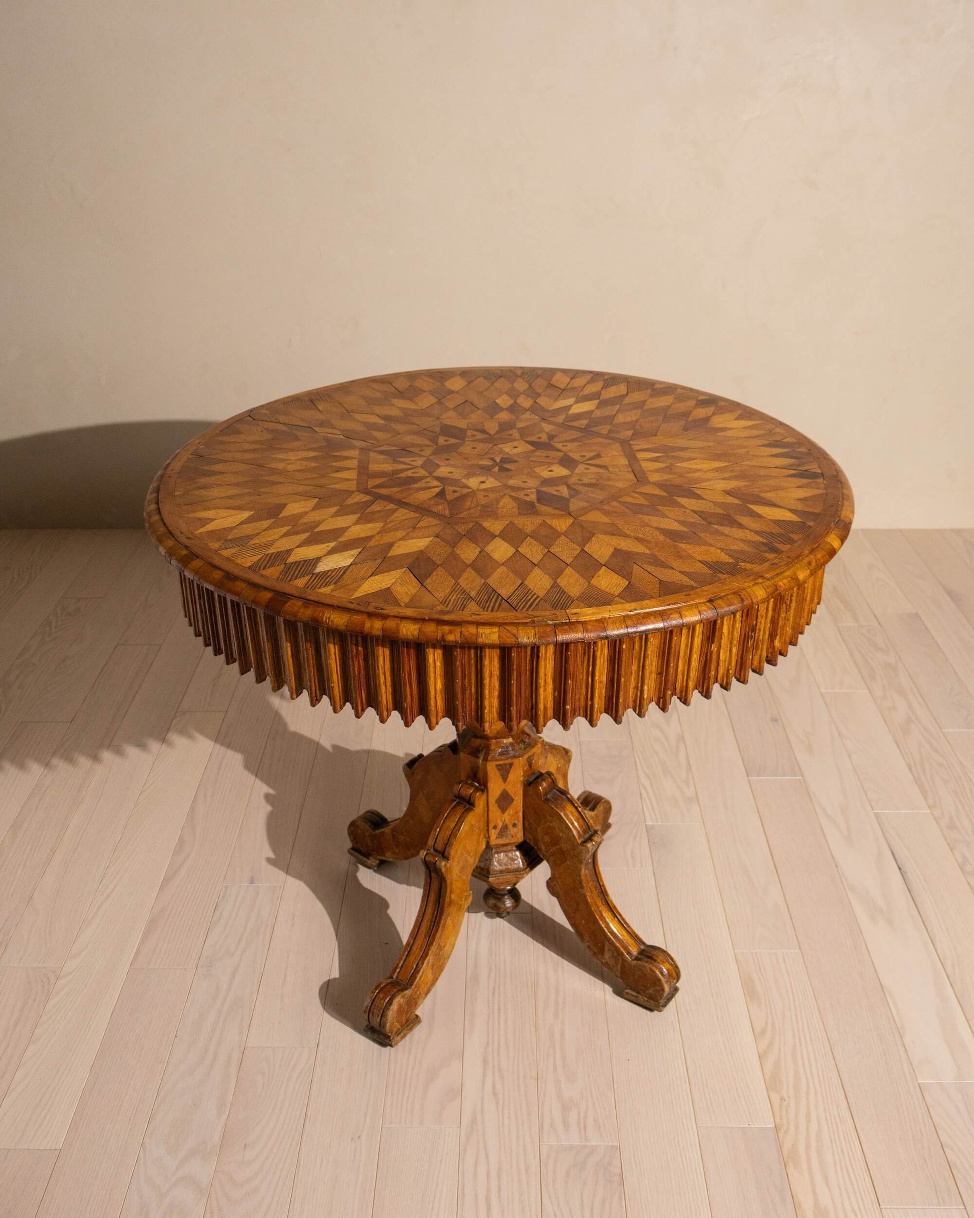 A visually striking marquetry centre table with geometric inlay, a sculptural base, and a richly aged surface. Crafted circa 1900.