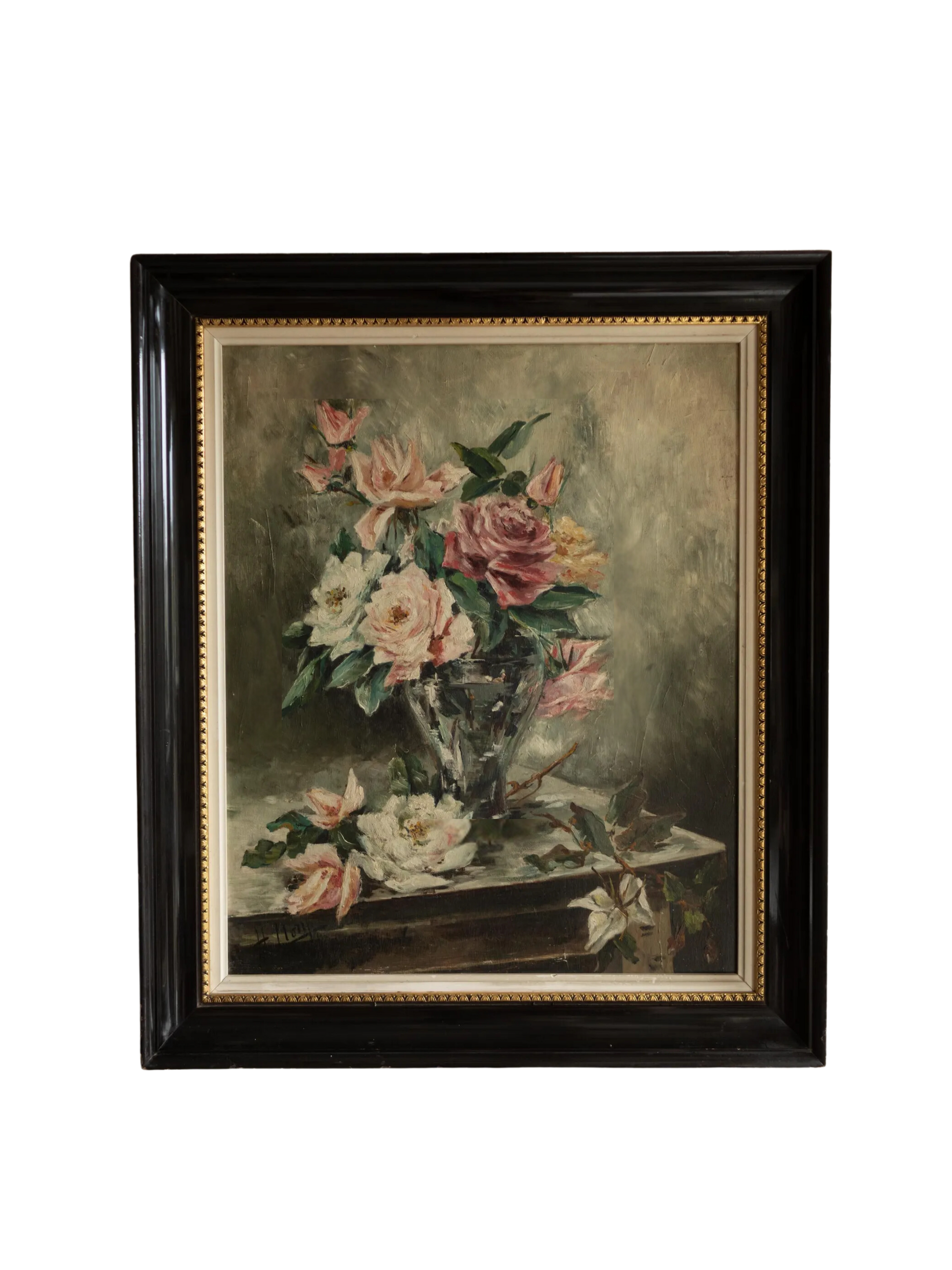 1930's Vintage French Rose Still Life Painting. This painting is painted on panel and comes in a thick black frame.
